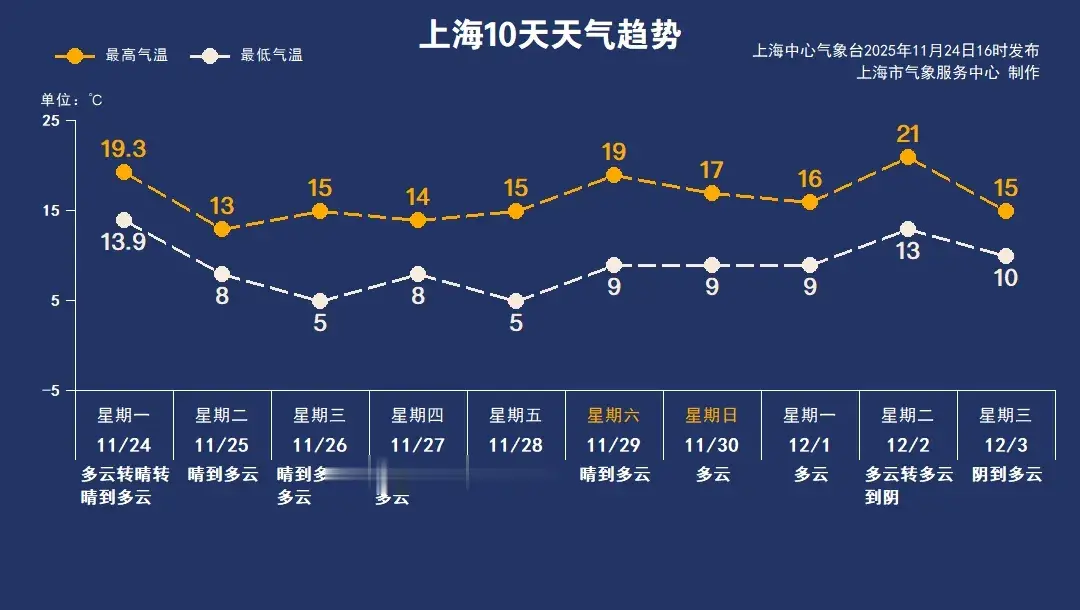 受辐射降温影响,周三早晨气温为近期低点,预计中心城区最低气温在5℃左右,郊区在0~3℃之间。白天略有回暖,最高气温在15℃左右。周四前后还将有新一股冷空气影响申城,届时,又有大风和降温天气。受冷空气打压,周五早晨的最低气温再度降至5℃附近。双休日最高气温又重回17~19℃。本周冷空气接二连三影响上海,气温起起伏伏,请及时调整着装。