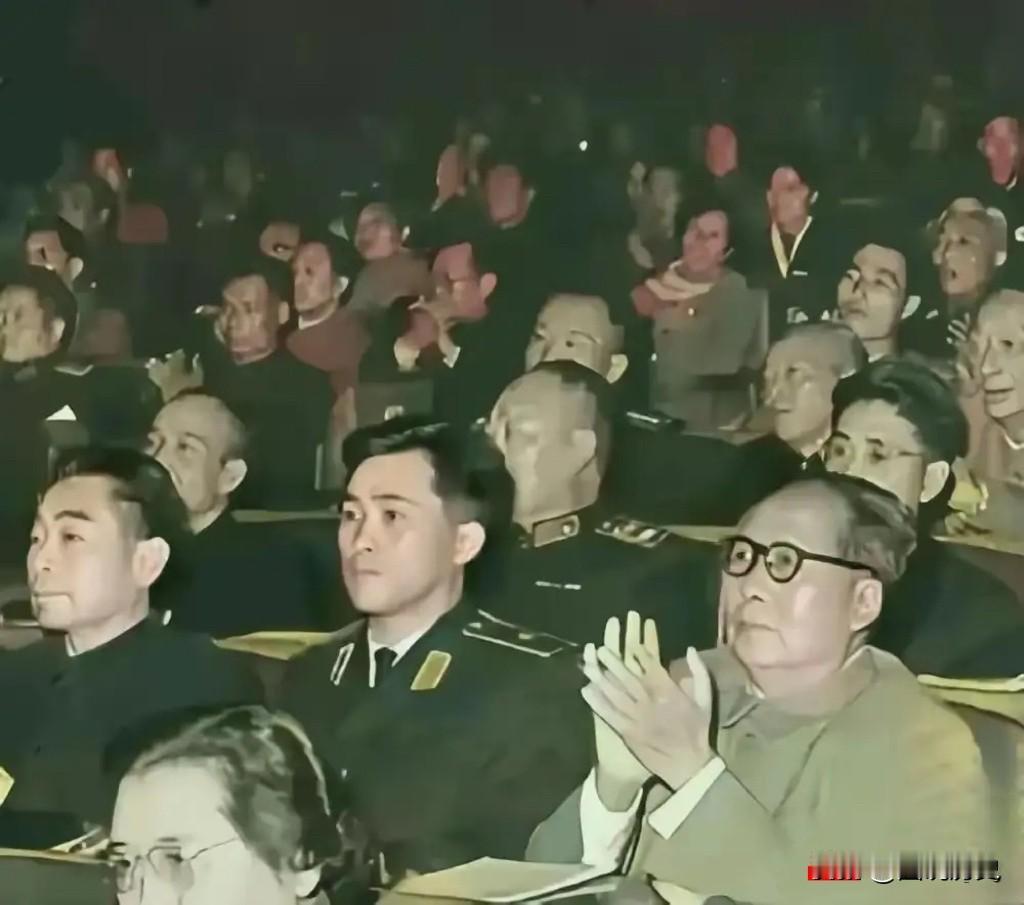 这张珍贵合影我还是第一次见到! 毛主席戴着眼镜的老照片真的太少看到了,基本很难看到,也就是毛主席70年代以后视力下降后,又加上患有白内障所以才佩戴眼镜,其他时候很难见到,这张老照片应该是拍摄于50年代末或者60年代初,毛主席应该是看演出的一张老照片,而且他和周总理中间那位年轻的同志是谁?有知道的么?他是一位作曲家!11月·每日幸运签 伟人图片