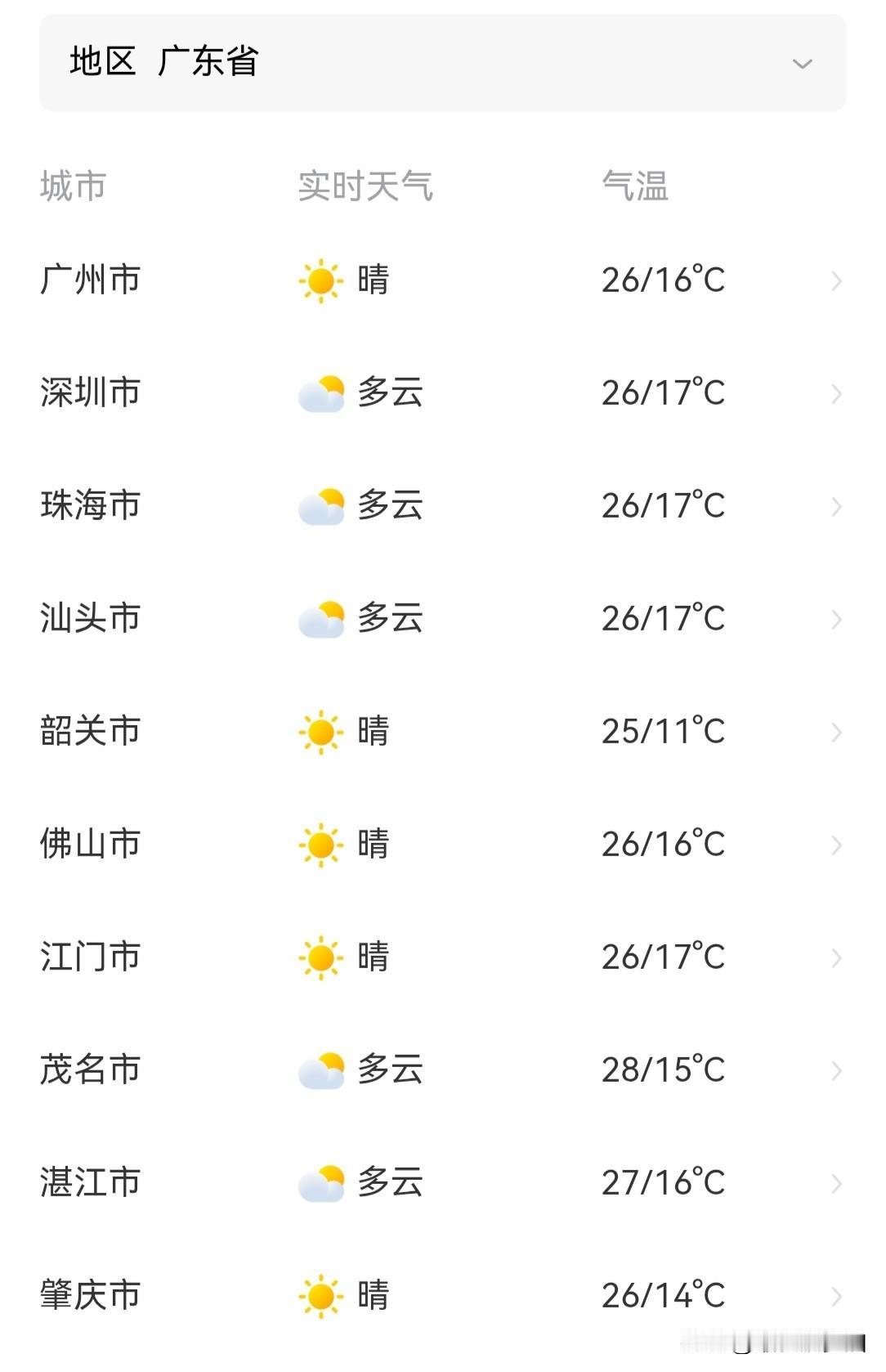 截至2025年11月24日, 广东全省大抵是官宣入秋了! 24日下午到25日弱冷空气影响广东, 27日有弱冷空气再次补充, 横竖都是要降温的。 弱冷空气频繁补充, 26日和27日早晨粤北山区部分市县将出现5℃左右的低温, 这悲伤没有由来的。 黯然地看着这气温波动, 昼夜温差那么大! 早晚是冷的, 中午是热的, 乱穿衣现象又重现江湖了! 广东天气持续晴朗干燥模式, 冷空气到来前又来一波“锋前增温”, 今天全省最高气温又升到28℃。 也罢! 广东的秋天大抵是个加长版的秋天吧!