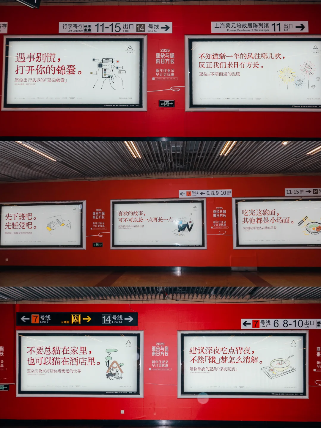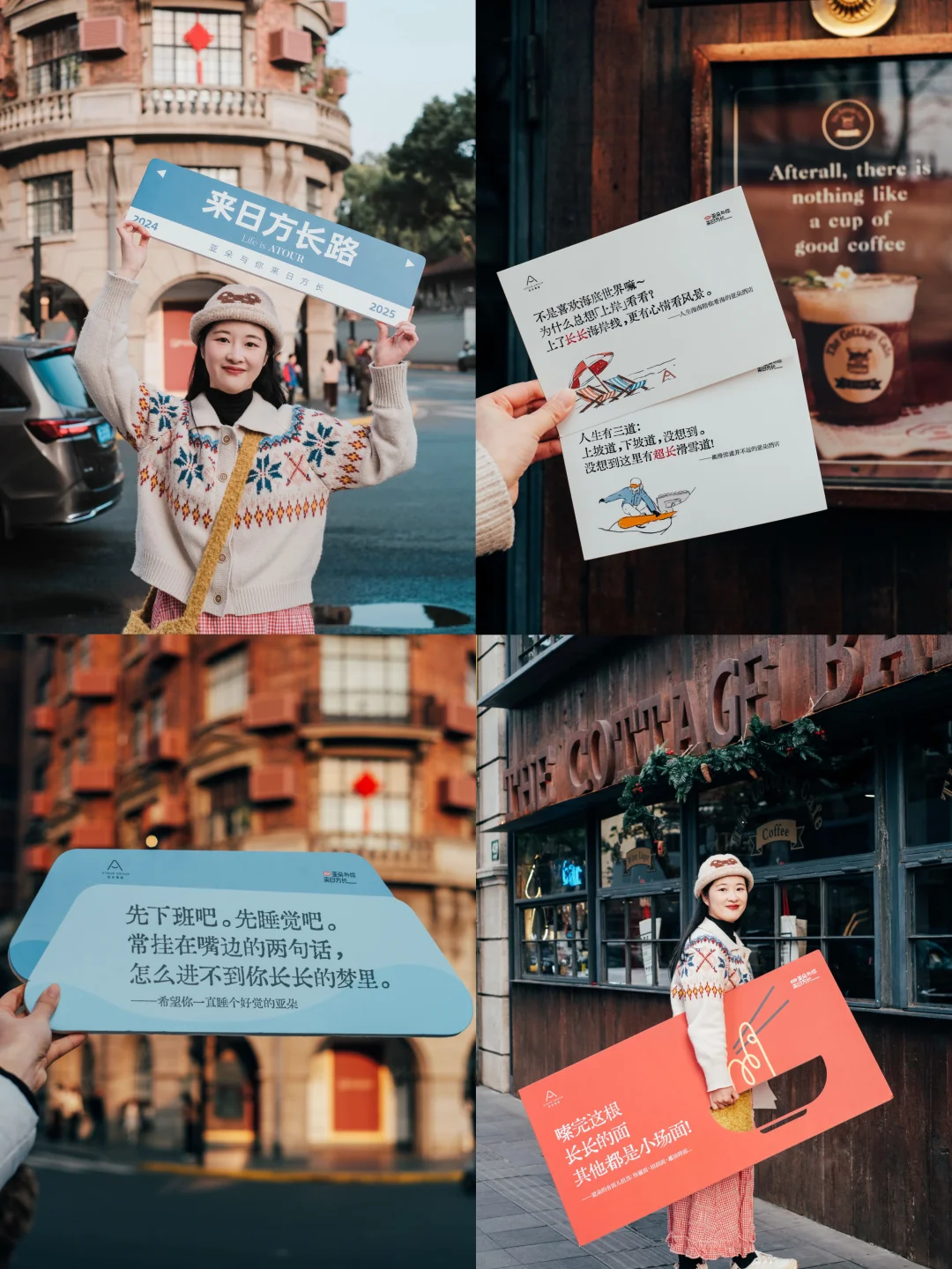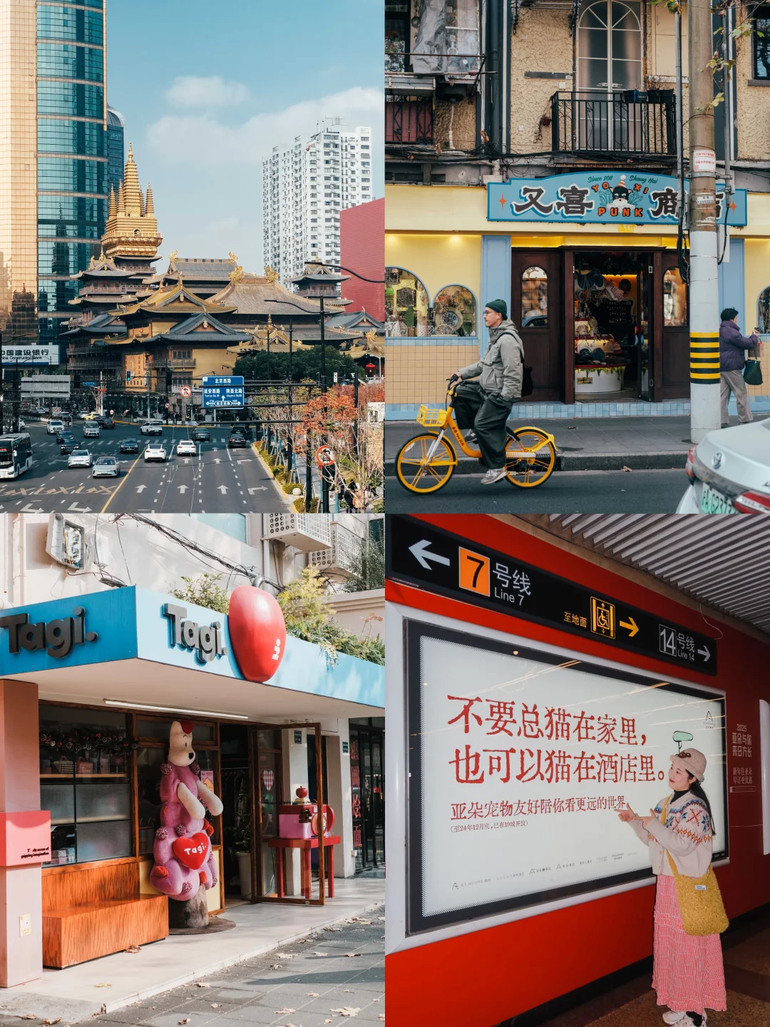 1️⃣静安寺:静安寺周边可玩的太多啦,第一站直奔华山路天桥,是打卡静安寺的绝佳机位,可以拍到整个静安寺全貌;坐地铁2号线出站的时候,被地铁里亚朵新年Campaign的温暖文字治愈到了:“不知道新一年的风往哪儿吹,反正我们来日有方长”“不要总猫在家里,也可以猫在酒店里”,每一段文字都让我这个打工人深深共鸣。