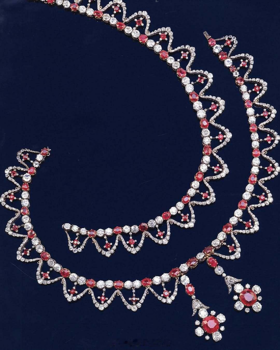 波旁-两西西里(讲道理派)族长夫人卡米拉的红宝石钻石项链,由尚美设计制作,据说曾属于某西班牙贵妇。1999年,新婚的卡米拉在苏富比拍下用于婚后行走江湖(她富家女,夫家穷剩头衔了)。此前项链卡米拉在2004年和2011年公开戴了两次,都与蜻蜓王冠搭配。上两个月在埃及博物馆开幕式戴的第三次资料:spanishroyaljewels