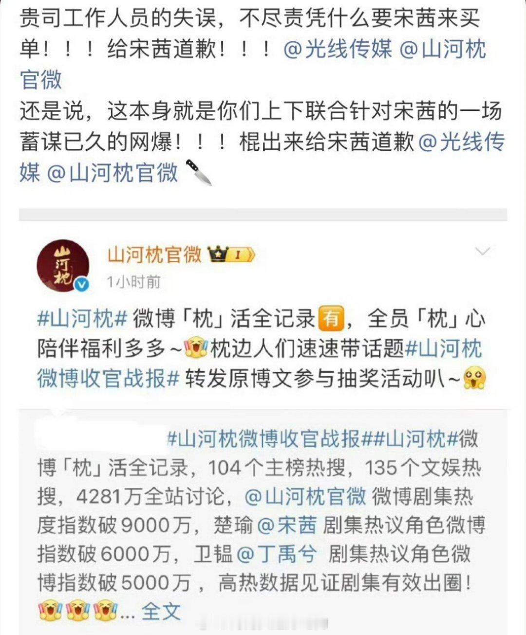山河枕收官战报不公,宋茜粉丝要求工作室告黑
