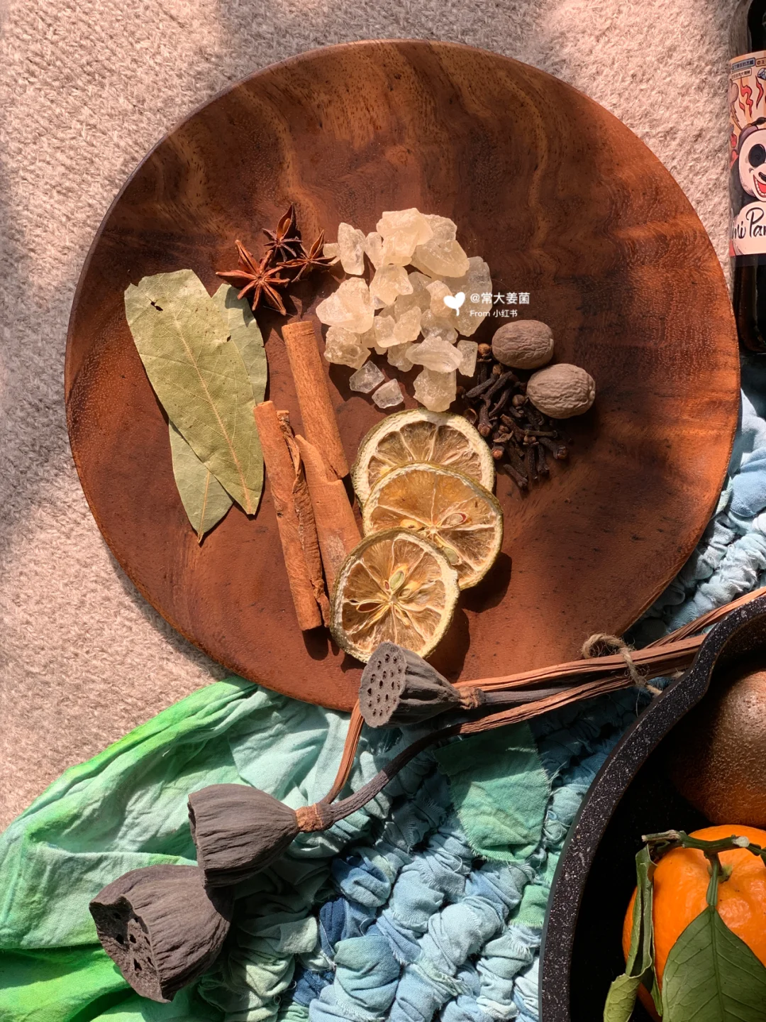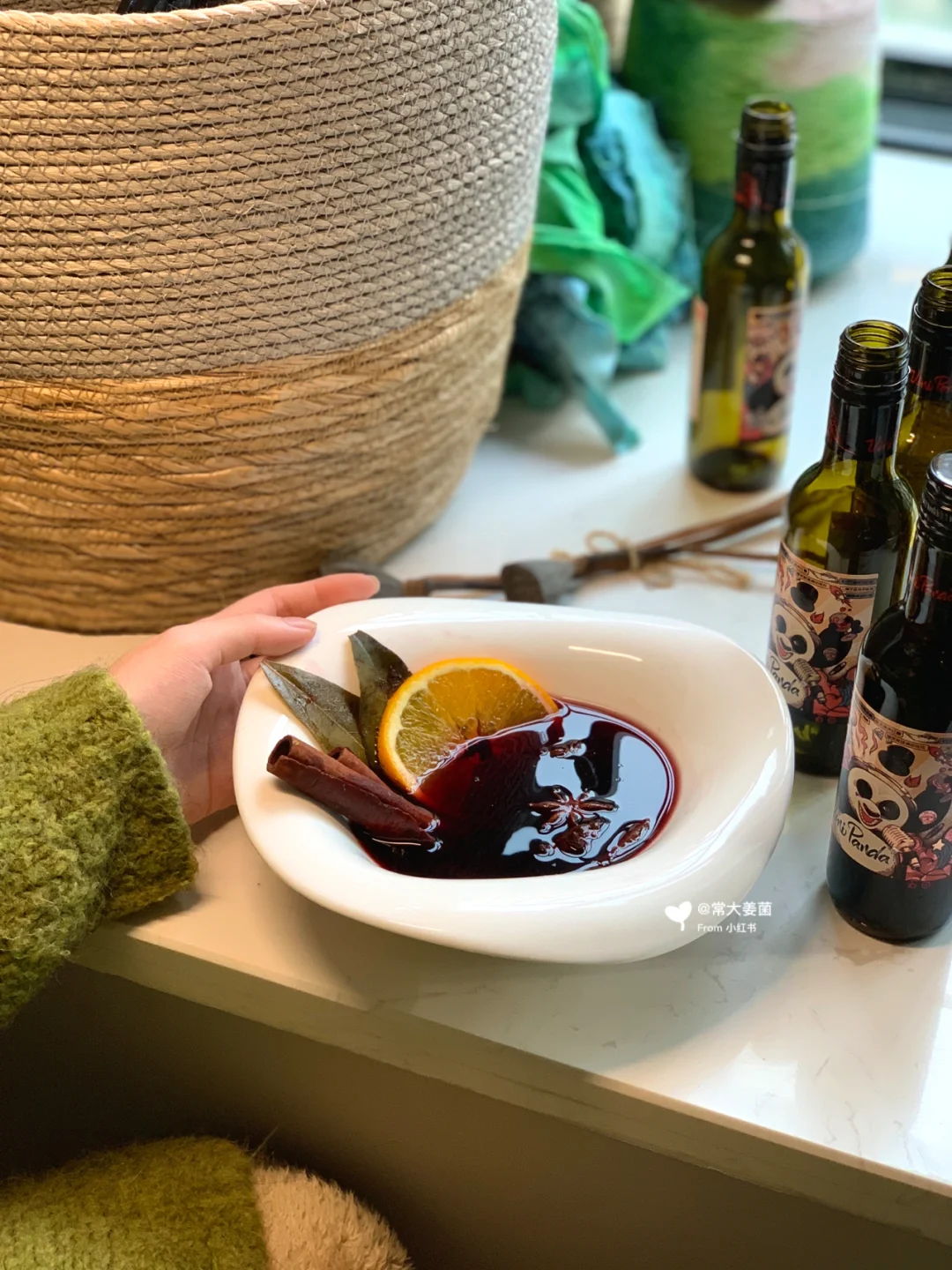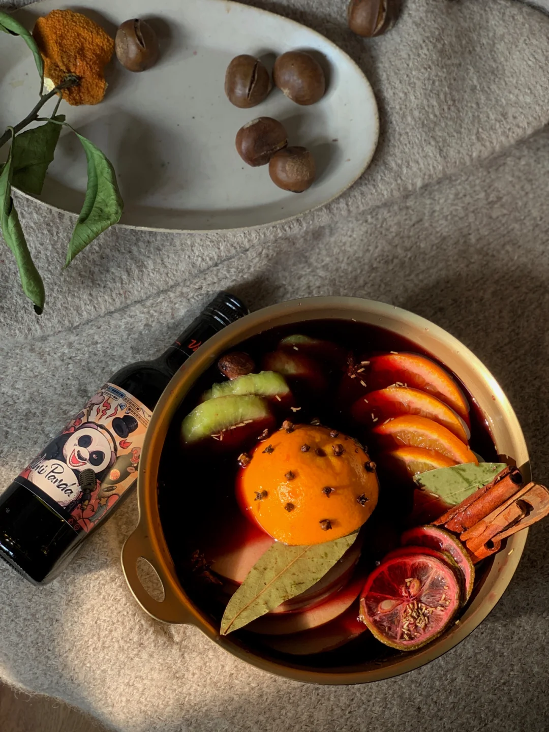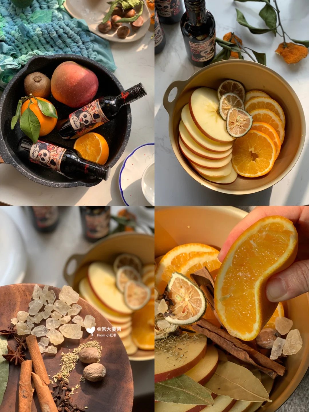 张裕小熊猫红酒➕香料(肉桂,丁香,香叶,八角,豆蔻,迷迭香(干鲜皆可))➕冰糖➕水果(🥝🍎🍊🍋干鲜皆可)。