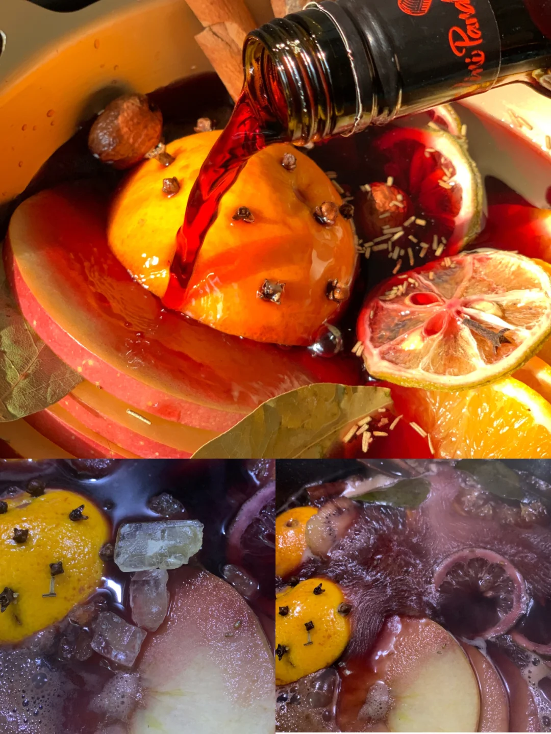 所有水果切片码在锅里👉🏻倒入香料,剩下的橙子挤汁,挤完插满丁香👉🏻倒入红酒,直至淹没水果,大🔥煮开,小🔥咕嘟五分钟即可出锅👉🏻剩下的就是随心装饰喽~