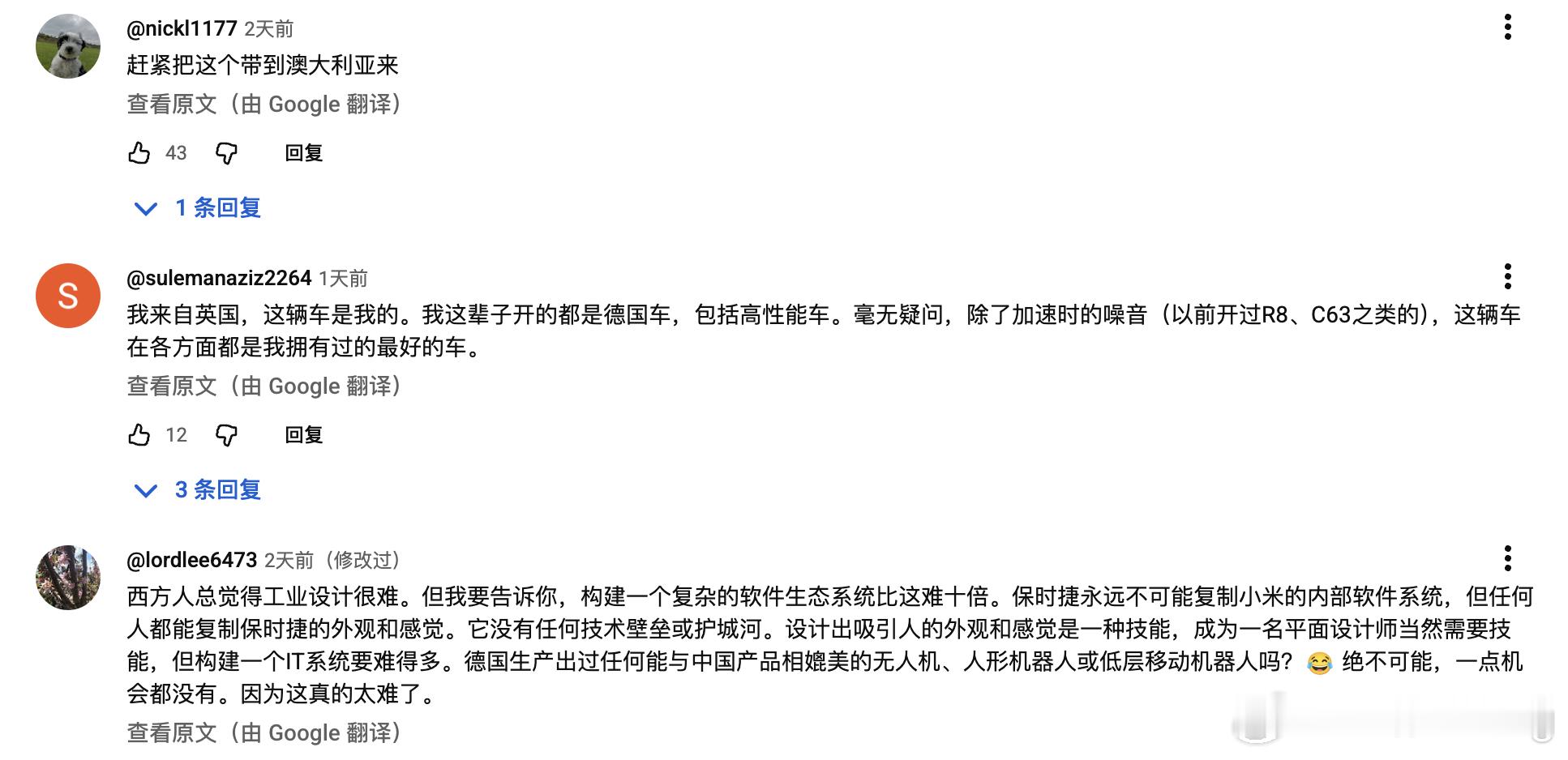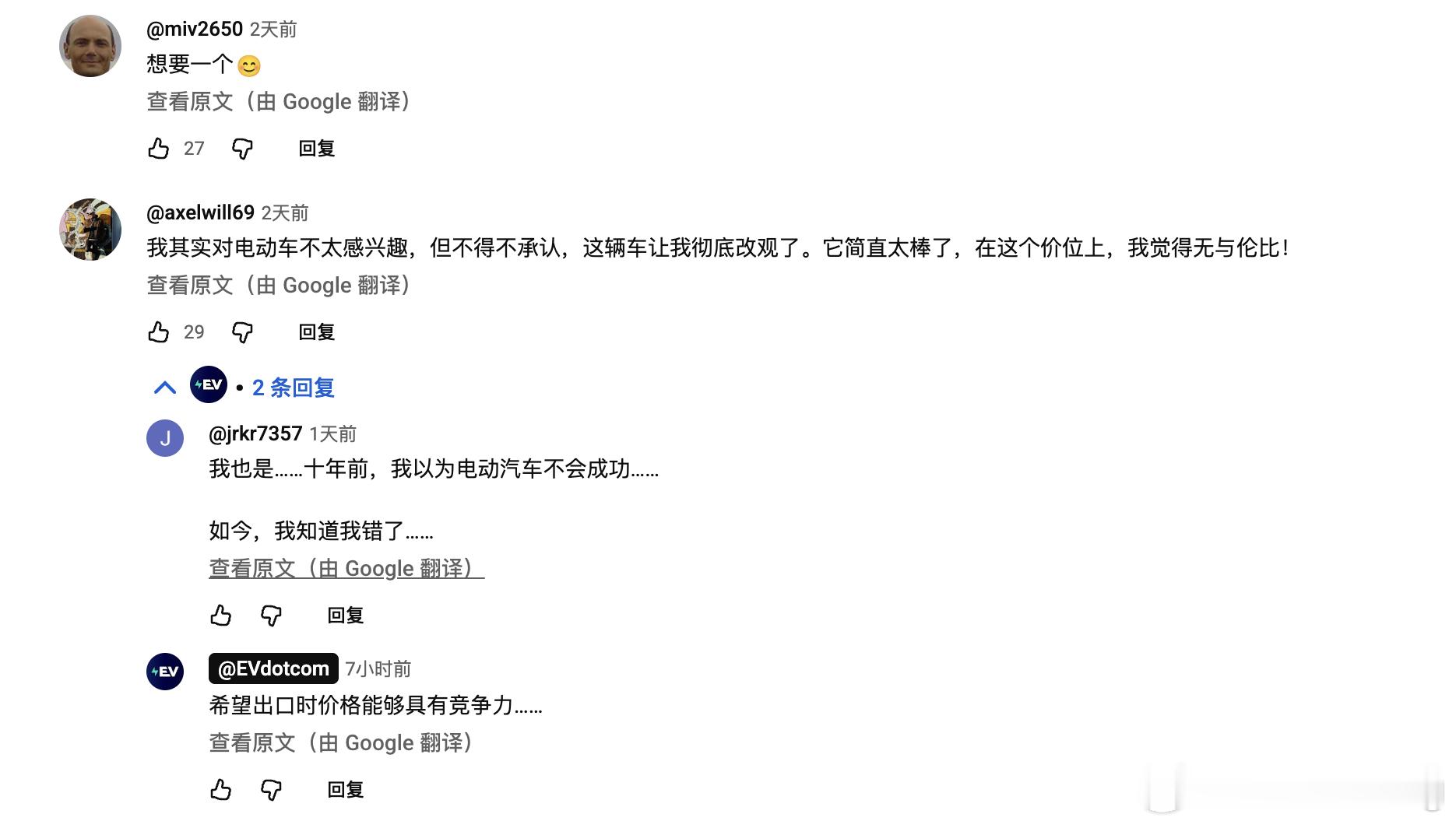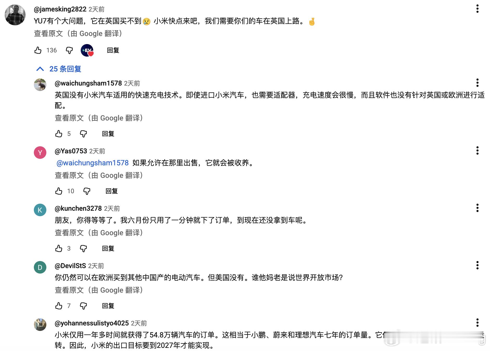 虽然小米汽车在国内因为各种原因受到这样那样的争议,但在几乎所有的外网评测中,它们都收到了极为一致的好评。这两天EV.com发布了他们对YU7的评测,不出意外地又是吹爆的评价,有充分选择权的智能化配置,以及优秀的车辆基础素质,都让评测人赞不绝口。同样,在评论区大家也能看到放十几年前的国内可能会非常熟悉的画风,来自全球各个地区的外国友人都在盼望着小米汽车来自己这边销售。也就那么十多年时间,国内外立场180°翻转,着实令人感慨,而且你仔细想想,这反转的时间是不是刚好从小米创办之初开始,一直到现在接近完成?这不是说小米有多大的功劳,而是说小米的发展历程,正好代表了中国制造从大到强的整个进程。现如今,小米作为国产纯电车的代表,被全球车媒所惊叹,像彭博社这样的新闻媒体,也在感慨中国汽车产业的强大,中国制造的崛起,已经成为一个无可避免的趋势,什么关税,贸易保护,都只是微不足道的绊脚石。总之,只要抛去立场与偏见,小米汽车的优秀是有目共睹的,不管是全球媒体的盛赞,还是国内像老章拆车,易车这样坚持客观的媒体评测,都能感受到小米在造车上的认真,最近第50万辆小米汽车的下线,也代表消费者认可了小米汽车的品质。相信在未来,小米汽车还会走的更好,更远。