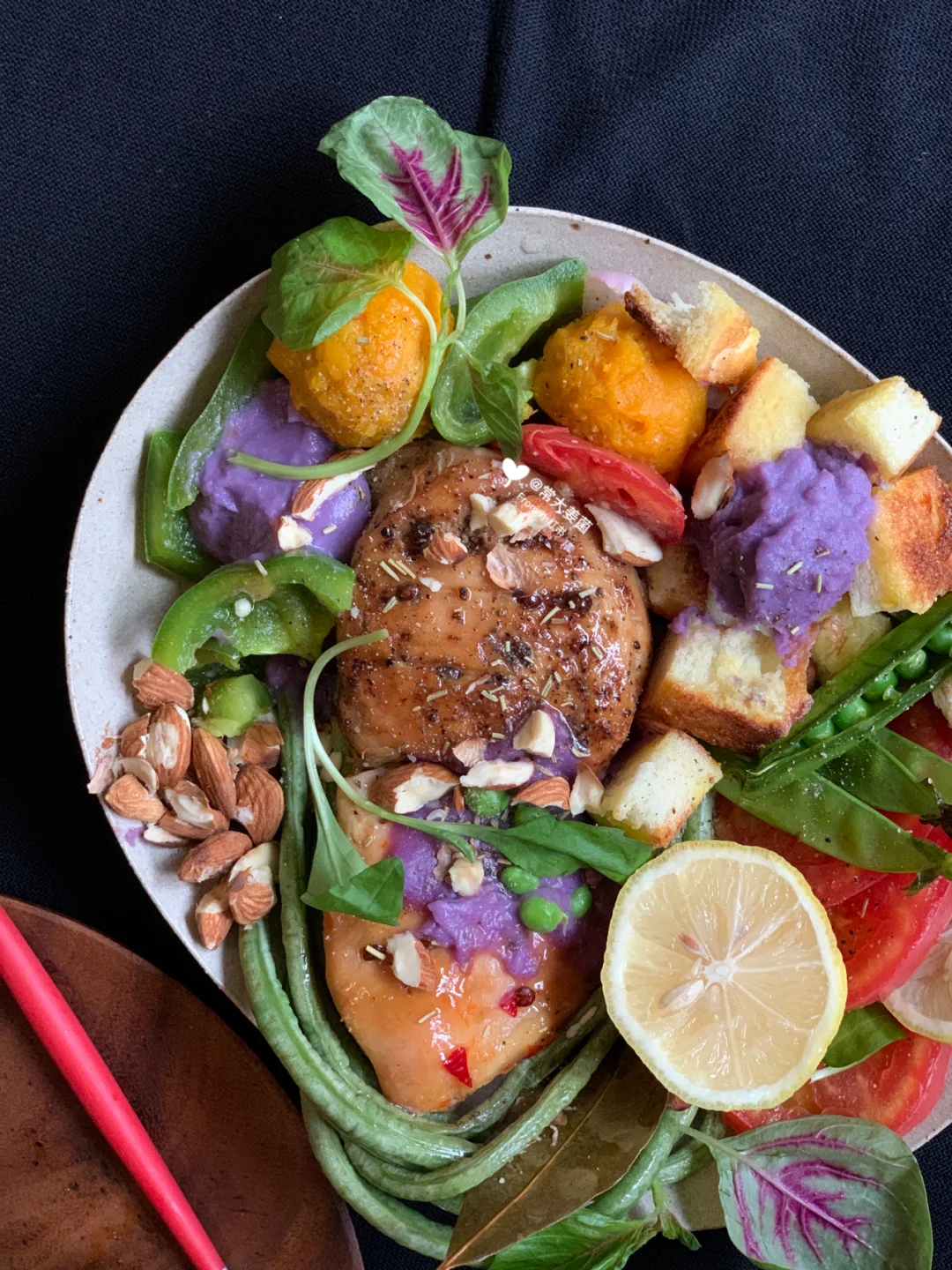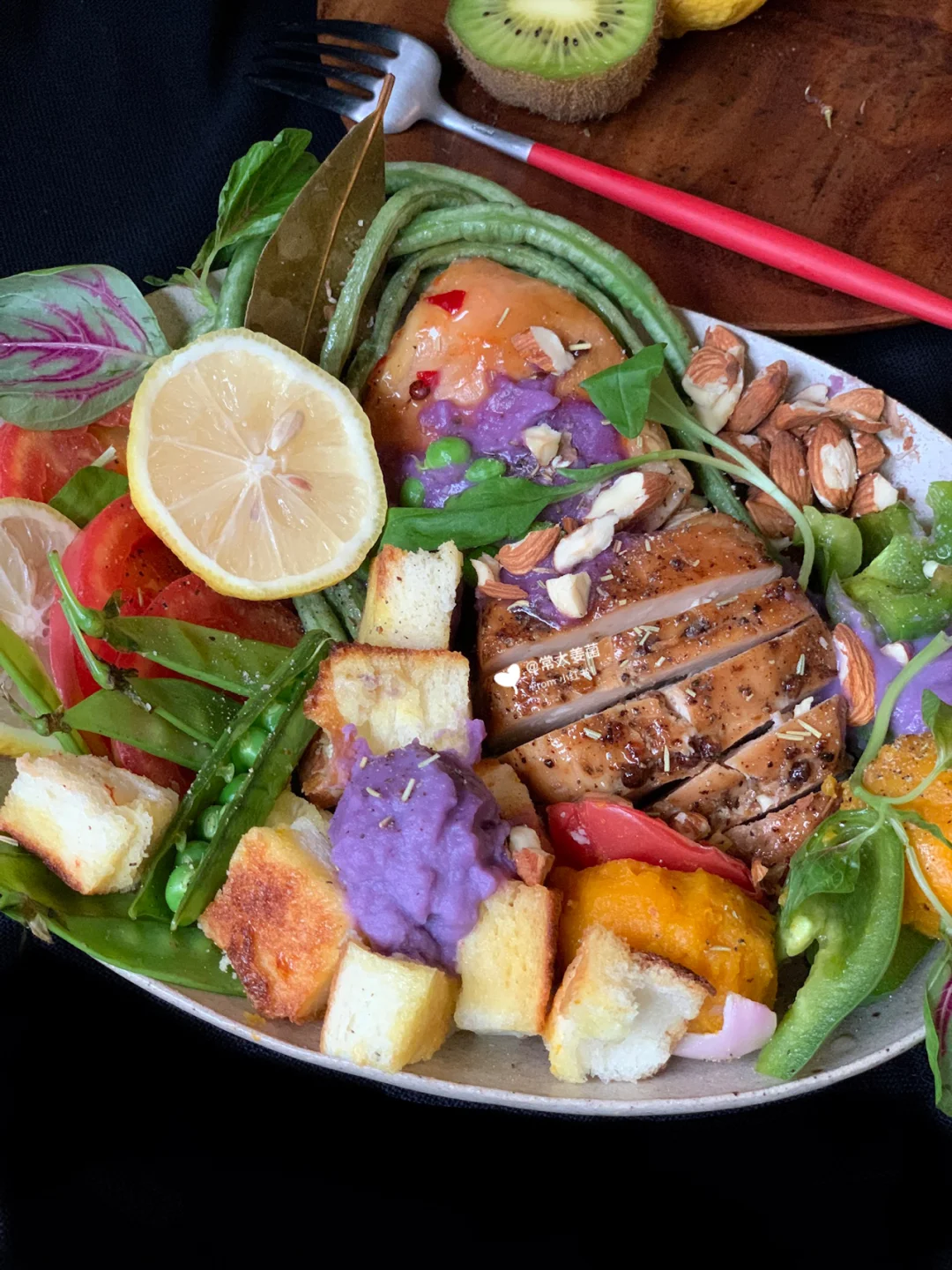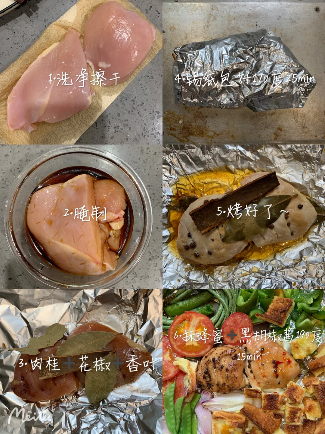 鸡胸洗净擦干👉🏻酱油➕料酒➕五香粉腌一晚👉🏻第二天肉上夹花椒➕香叶➕肉桂包锡纸180度25min👉🏻锡纸脱下,鸡胸抹蜂蜜➕黑胡椒酱~蔬菜抹油撒盐,面包切小丁,190度15min👌🏻