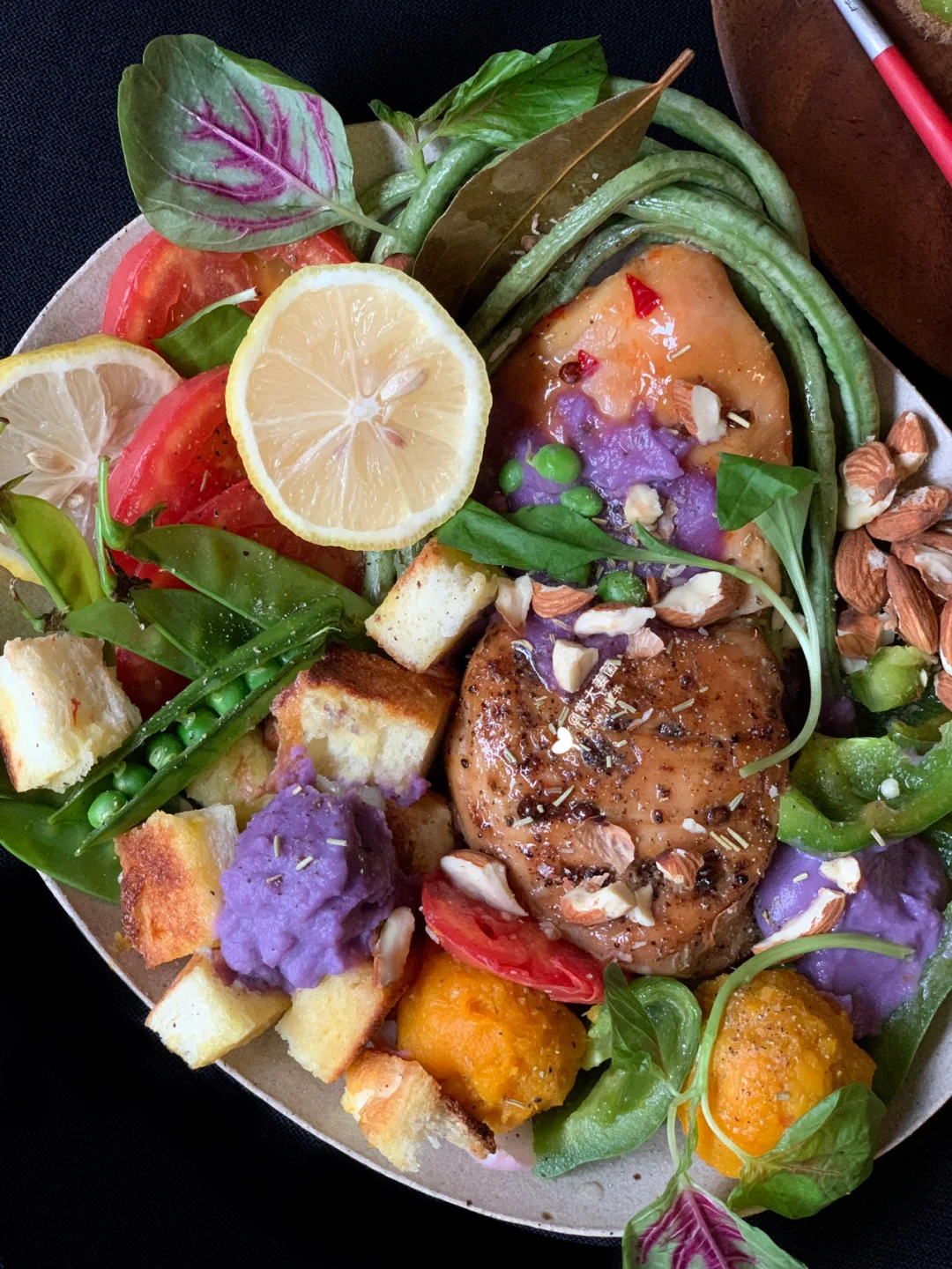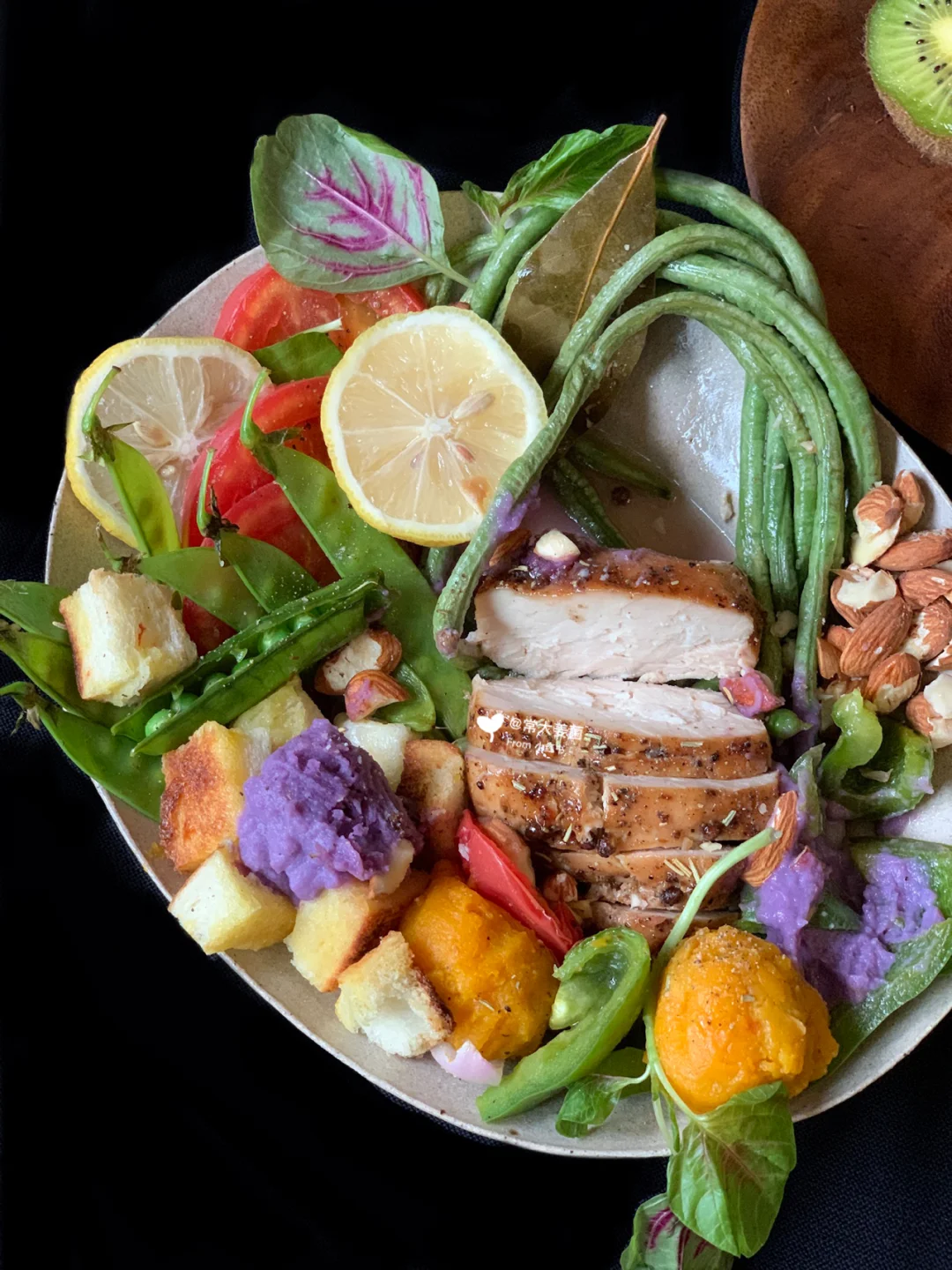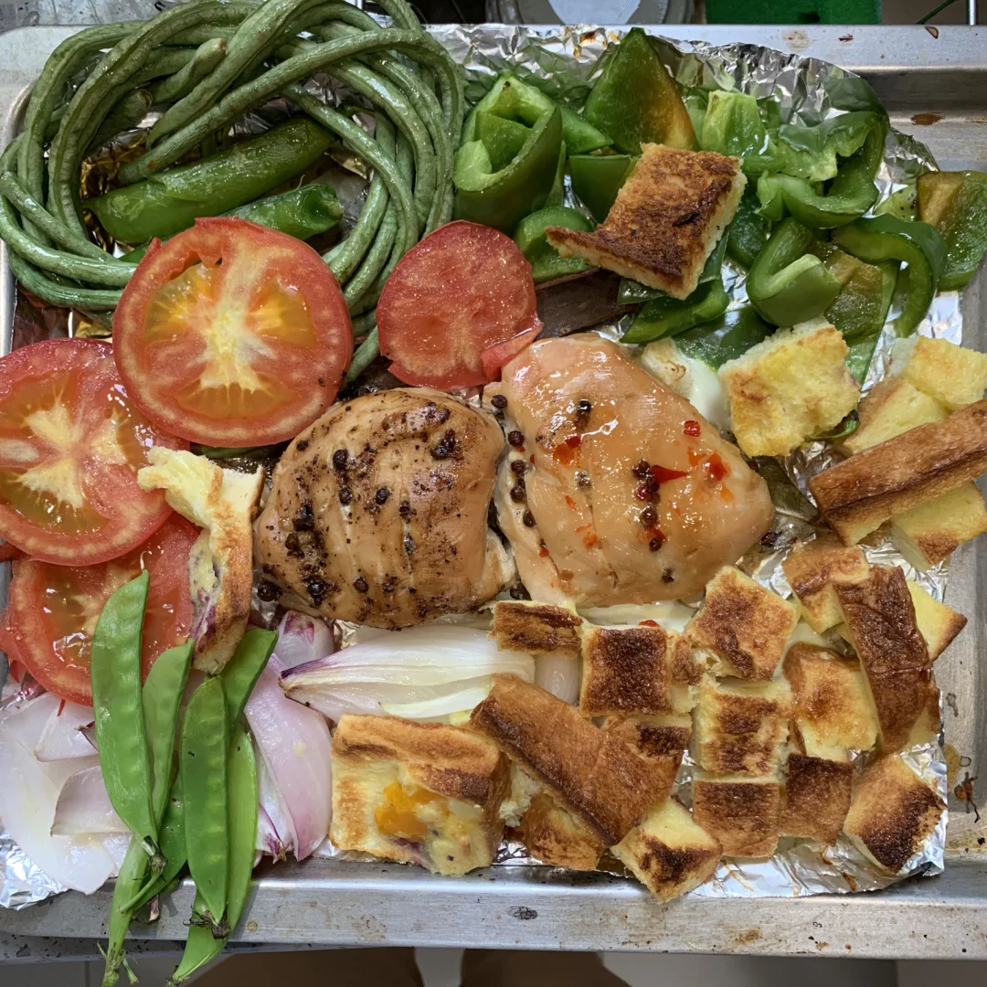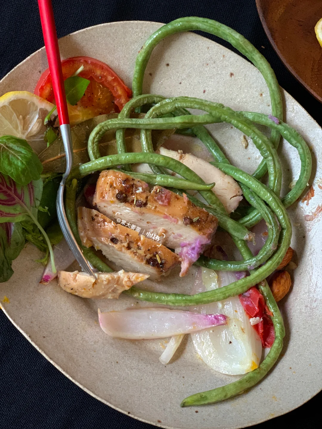 鸡胸洗净擦干👉🏻酱油➕料酒➕五香粉腌一晚👉🏻第二天肉上夹花椒➕香叶➕肉桂包锡纸180度25min👉🏻锡纸脱下,鸡胸抹蜂蜜➕黑胡椒酱~蔬菜抹油撒盐,面包切小丁,190度15min👌🏻