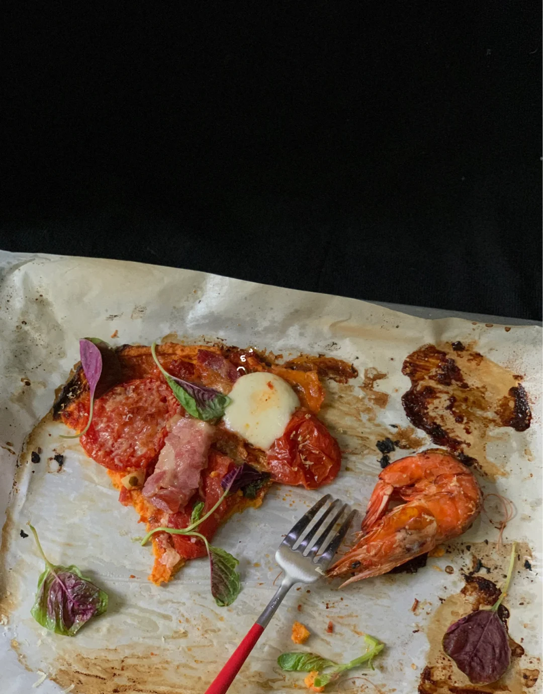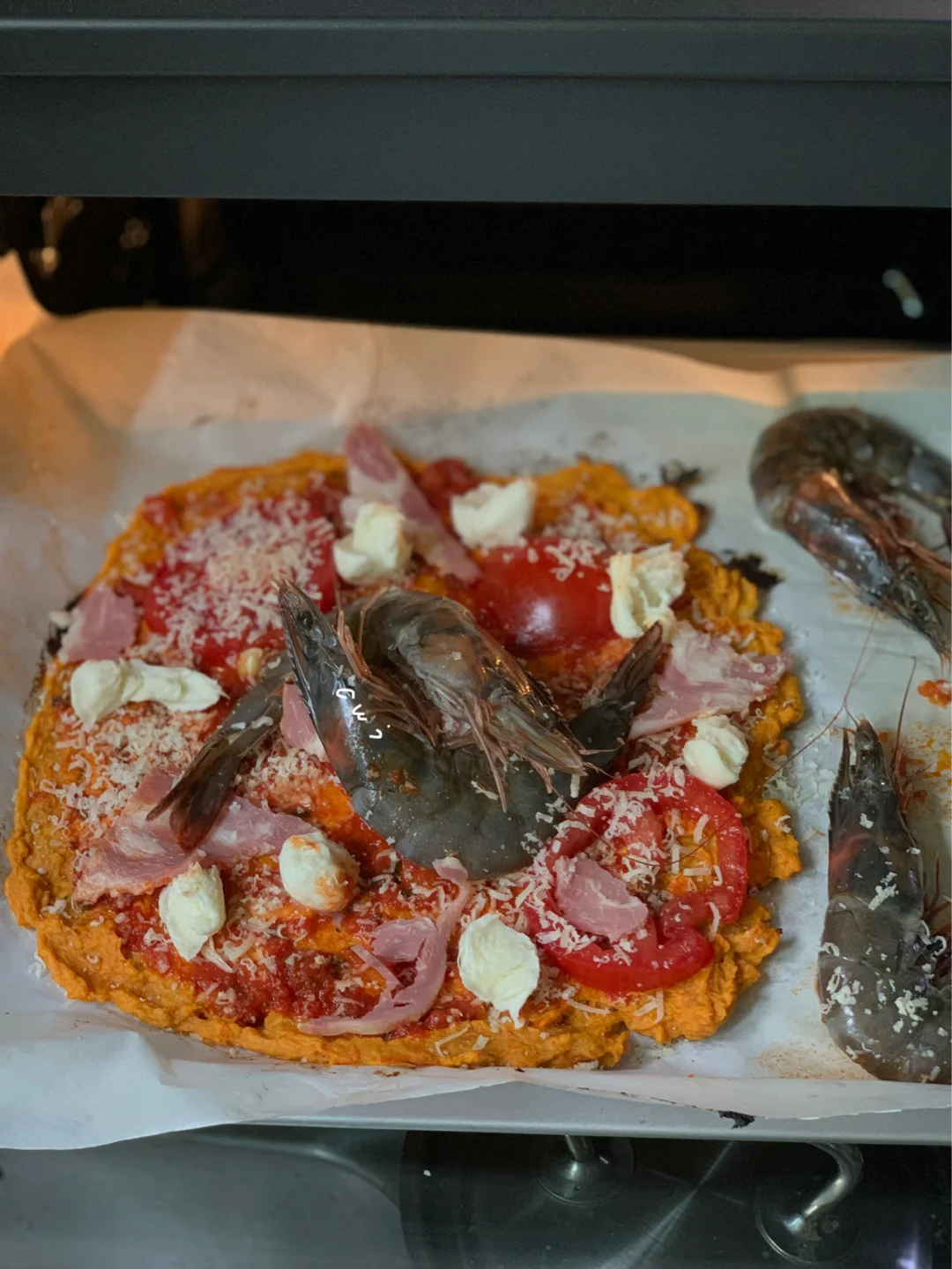 红薯底披萨比普通披萨热量➖1/3,摆放的食材完全是个性添加,在这里我拿鲜甜的🍅和鲜🦐搭配红薯的甘甜,开胃而鲜甜、风味极佳,回味无穷呢~