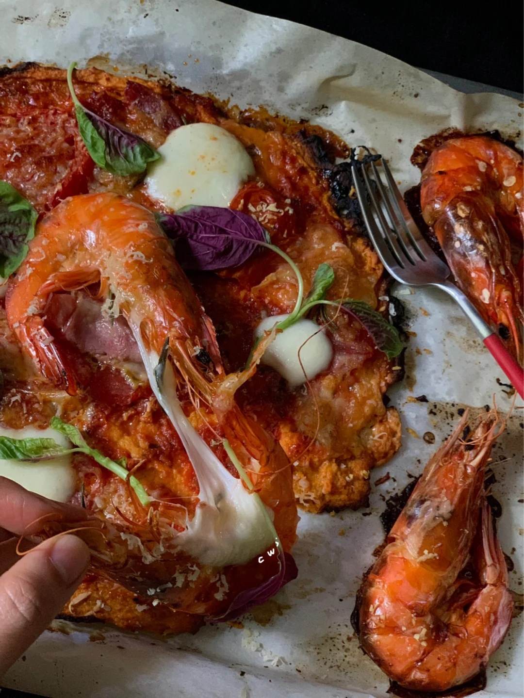 番茄酱底➕欧芹段👉碎马苏里拉芝士👉小番茄、大虾、培根、芝士球👉撒盐在🦐上。