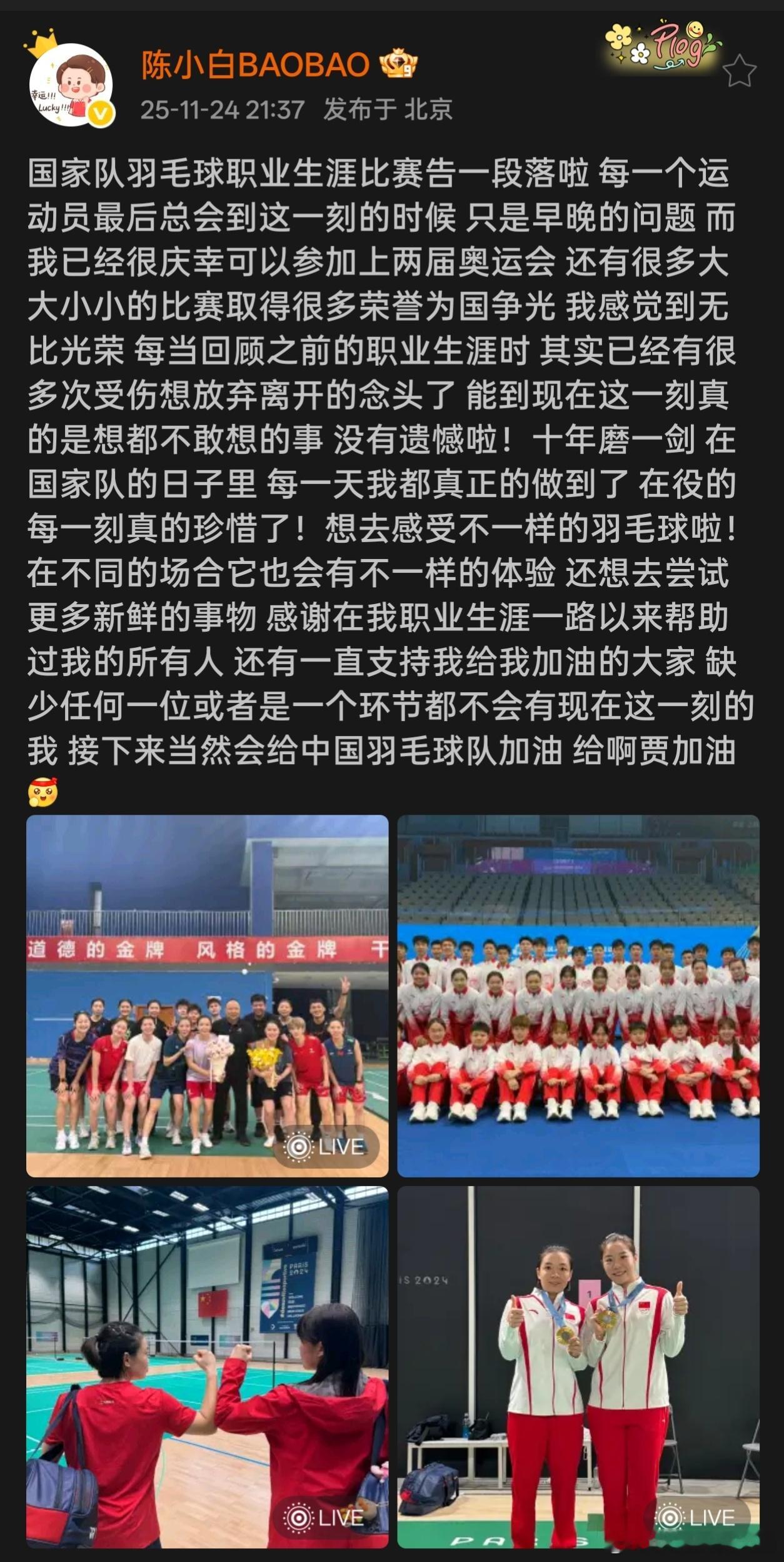 发博正式退出国家羽毛球队祝陈姐未来一切顺利,生活更加幸福更加精彩!毕业快乐🥹🎉