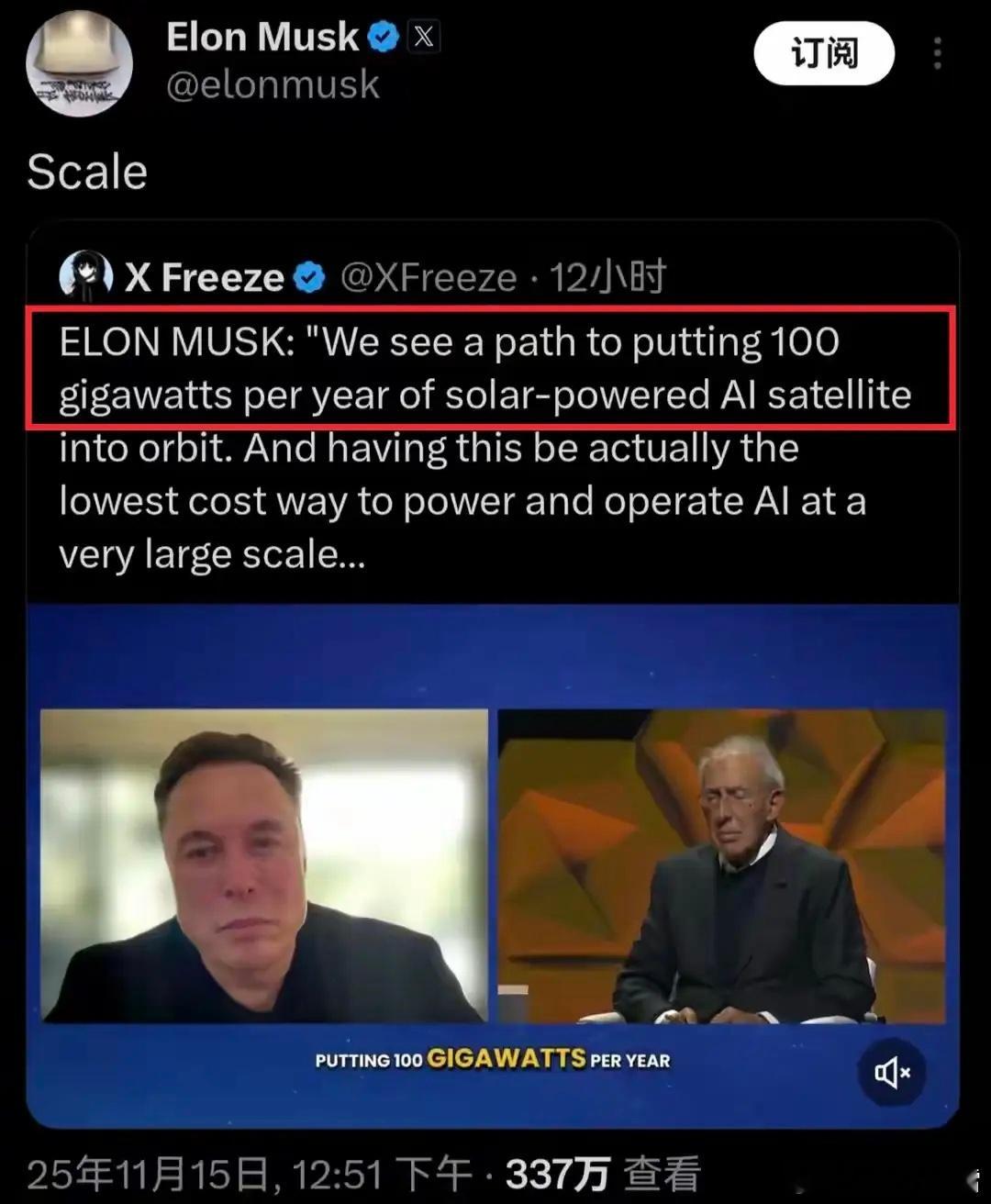 马斯克太空AI数据中心:科幻故事还是现实可能?马斯克提出每年部署100吉瓦太阳能AI卫星,打造太空数据中心的构想,被黄仁勋揶揄为“一场梦”。目前中美虽有实验性探索——东大已发射12颗互联计算卫星,Starcloud将英伟达H100送入太空,但近地轨道温差、太空碎片问题,及地球静止轨道的高发射成本,均构成大规模部署的现实阻碍。这场绑定AI与航天的市值叙事,是否折射出AI泡沫下的科幻化倾向,值得理性审视。