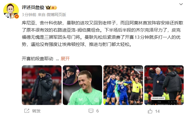 直播吧11月25日讯曼联本轮0-1不敌十人埃弗顿,赛后,评述员詹俊发文点评。