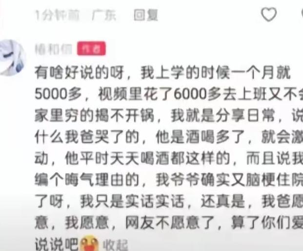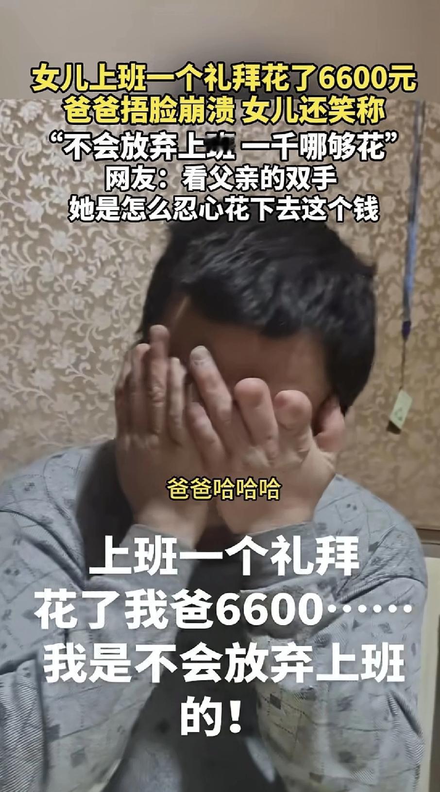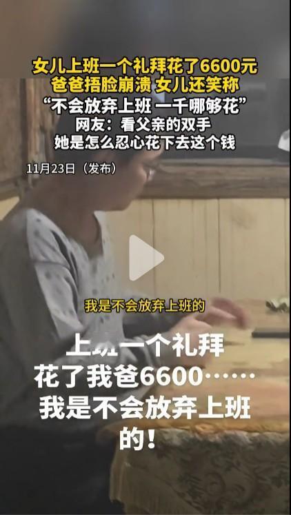虽然看起来拍的是段子,爸爸的哭泣表情也是在故意表演,脸上还带着隐隐的笑容;但女儿如此魔性的笑声,加上有违人伦的语言,还是让人心里非常难受。这个父亲的手指是残缺的,可见挣点钱有多么不容易。但女儿不仅没有一点体谅,还用如此的大笑来说自己一周花了父亲6600元,良心真的不会痛吗?即使爷爷真有脑梗,用如此的笑声来强调爷爷的病情,也是一种非常不孝。这样的段子,还是少拍点吧。