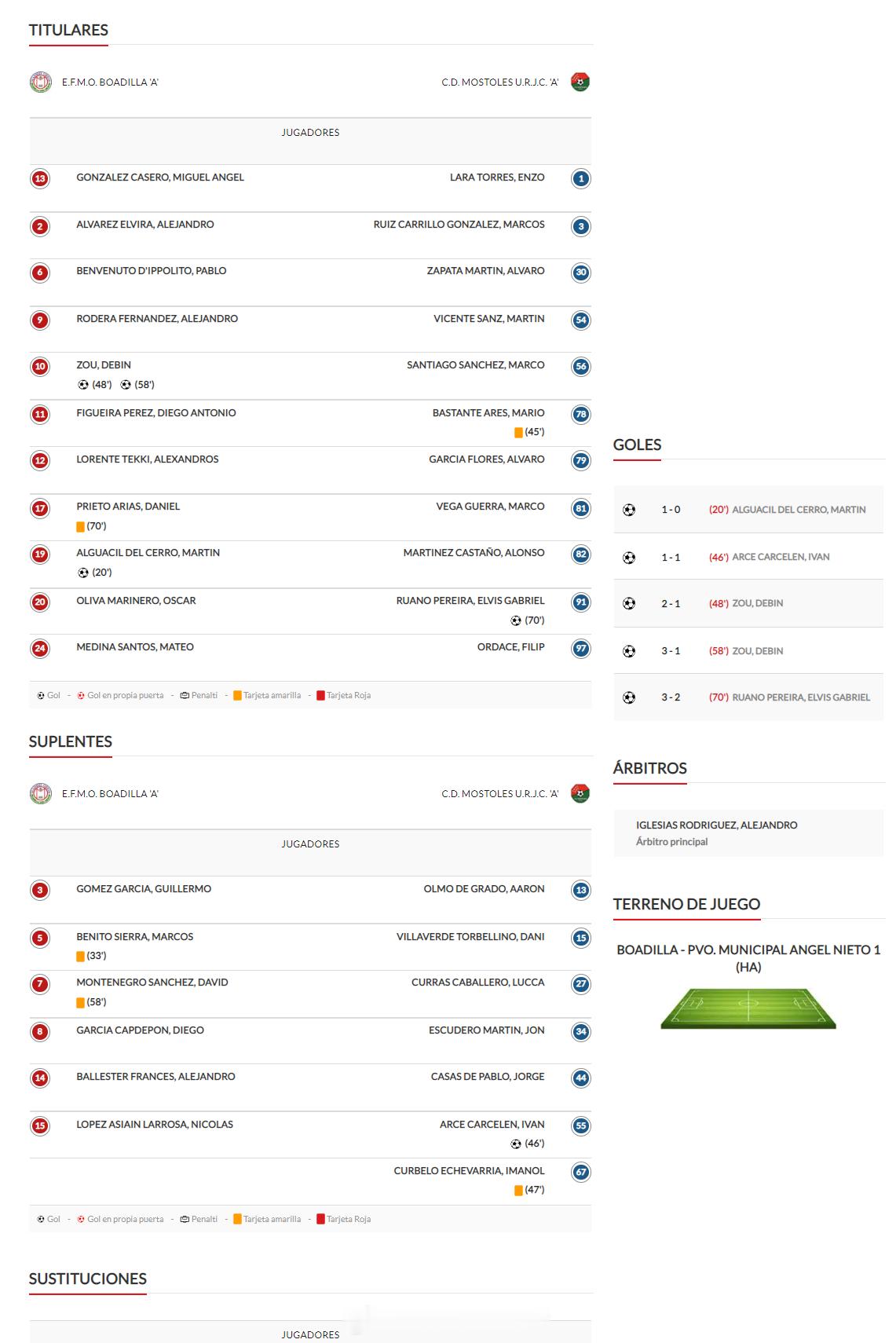 梅开二度。11月22日,西班牙马德里U14荣誉联赛(2)第2组第9轮,EFMO博阿迪利亚U16A队客场3比2战胜对手,邹德滨(2012)继续首发出战,第48、58分钟连进两球,帮助球队扩大比分优势。截至本轮,邹德滨共首发出场8次,打进7球,球队以7胜2平、进26球丢13球的不败战绩高居榜首。