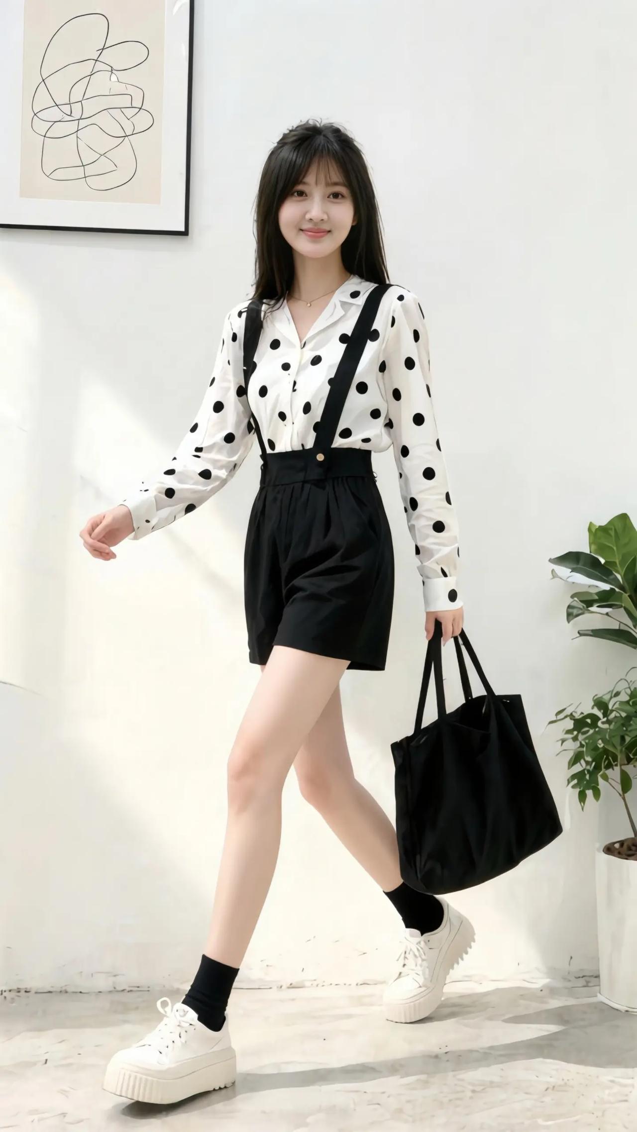 你喜欢哪一种气质的美人? 黑白波点衬衫+黑色短裤,搭配白色运动鞋,轻松时尚!
