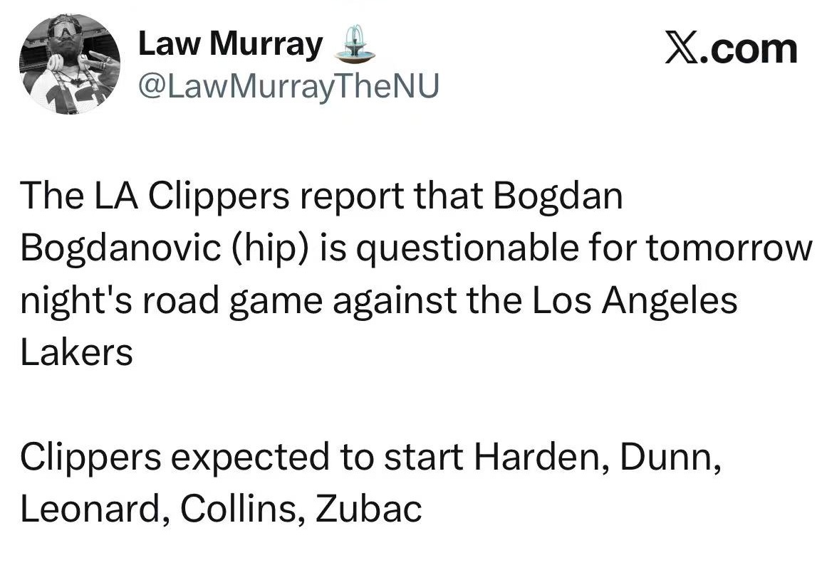 快船队官方通报,博格丹(臀部伤势)明日对阵湖人“出战成疑”。预计首发:哈登、邓恩、伦纳德、科林斯、祖巴茨。