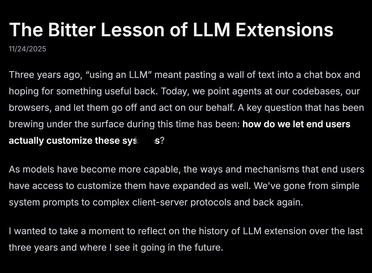 The Bitter Lesson of LLM Extensionswww.sawyerhood.com/blog/llm-extension本文回顾了过去三年LLM扩展机制的演进历程,并展望了未来发展方向:与其为每个任务设计专用工具(如MCP),不如赋予代理通用计算能力(如访问shell、运行脚本),并信任其能自主组合使用。这正是“苦涩的教训”的体现——智能应来自通用能力与学习,而非人为设计的复杂规则。LLM扩展机制发展脉络1️⃣ChatGPT插件(2023年3月):首次尝试让LLM调用外部API,理念超前但受限于模型能力与复杂体验。2️⃣自定义指令(2023年7月):以简单文本附加方式解决重复上下文问题,成为后续配置文件的雏形。3️⃣自定义GPT(2023年11月):将提示与工具打包为专用“应用”,转向更易用但封闭的形态。4️⃣记忆功能(2024年2月):实现自动化的长期个性化记忆,标志代理开始具备持续状态管理能力。5️⃣ Cursor规则(2024年4月):将配置文件(如.cursorrules)纳入代码库,实现开发场景下的原生集成。6️⃣ 模型上下文协议MCP(2024年11月):通过客户端-服务器架构赋予LLM真实操作能力(如读取代码库、查数据库),功能强大但使用复杂。7️⃣ Claude Code(2025年2月):集成多种扩展方式,包括子代理、钩子、斜杠命令等,功能全面但部分特性已被弃用。8️⃣ 代理技能(Agent Skills, 2025年10月):以轻量化的Markdown文件(SKILL.md)和脚本定义能力,避免MCP的上下文膨胀问题,回归“给指令+通用工具,由模型自主完成”的理念。