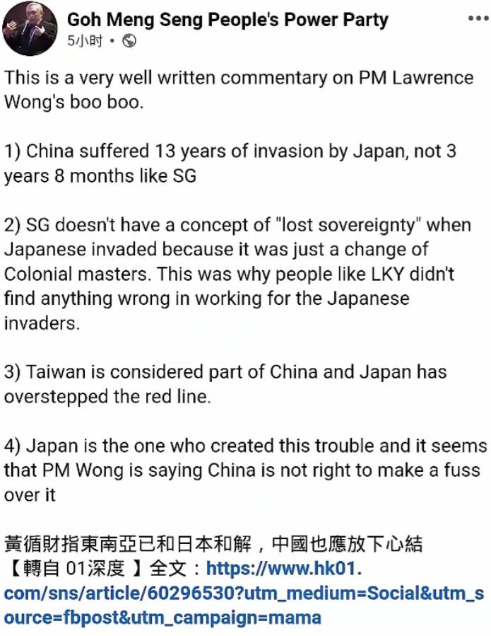 新加坡内部开始批评黄循财站队日本,帮高市早苗说话,认为黄循财搞错了因果关系,是高市早苗不当言论在先,中国反击在后,黄循财怎么反而说要中国放下历史,这是颠倒因果,不问青红皂白,拉偏架! 这波操作让不少新加坡人都忍不住吐槽:因果关系都搞反了,还谈什么中立? 要知道,今年可是中国人民抗日战争暨世界反法西斯战争胜利 80 周年,这么敏感的历史节点,高市早苗偏要往枪口上撞。 更过分的是,高市早苗压根没打算认错。面对各国反对,她嘴硬得很,拒不撤回错误言论,还在那装模作样说 “想稳定对华关系”。 可黄循财偏偏选择性失明。他看不到高市早苗的步步紧逼,看不到日本国内的反对声音 — 东京、京都上千名民众举着牌子在首相官邸前抗议,喊着 “不要战争,撤回妄言”; 前首相鸠山由纪夫、石破茂都站出来反对,说她这是把日本往火坑里推; 他更看不到国际社会的鲜明立场。联合国秘书长发言人直接重申遵循联大第 2758 号决议,间接打了高市早苗的脸; 俄罗斯痛批日本在加速再军事化;朝鲜干脆关了双边沟通渠道;就连东南亚的缅甸,都两天内四次发声,一边坚定支持一个中国原则,一边谴责日本法西斯主义死灰复燃。 这些国家都看得明白的道理,黄循财却偏要拧着来。他不仅呼吁中国 “搁置历史”,提钓鱼岛时还用上了日本单方面叫的 “尖阁群岛”,这哪是什么中立,分明就是赤裸裸的偏向。 要说这新加坡自己也是多元种族国家,一直重视历史记忆对国家的意义,怎么到了中国的核心利益和历史伤痛上,就突然没了敏感度 可讽刺的是,高市早苗心心念念的美国盟友,也没给她多少面子。之前特朗普访日,高市早苗想让他给日本国旗敬礼,结果特朗普径直走了过去,让她当众尴尬。 后来被问到中日风波,特朗普更直接说 “很多盟友不是朋友,还占美国便宜”。更关键的是,部署在日本的美军 “堤丰” 中程导弹系统,已经悄悄撤回国了。 盟友都在忙着自保,高市早苗还在那硬撑着挑衅,实在可笑。 可黄循财却看不到这些前因后果。台湾问题是中国的核心利益,就像新加坡的国家主权不容干涉一样,这是底线中的底线。 高市早苗都已经踩到红线上了,中国反击是天经地义,结果黄循财反倒要求受害者妥协,这逻辑实在让人无法理解。 就连中国台湾地区的评论员蔡正元都忍不住怒批,说新加坡这是在做外交蠢事,该好好上一课认清局势。 黄循财可能以为自己是在 “劝和”,实则是在纵容挑衅。他想学之前的 “和稀泥” 模式,却忘了这次的争端根本不一样 , 这不是简单的利益分歧,而是有人公然挑战主权底线; 其实大家愤怒的核心很简单:因果不能乱,是非不能混。高市早苗的挑衅是因,中国的反击是果;维护主权是对,干涉内政是错。 黄循财的表态,恰恰模糊了这最基本的是非界限。历史不是说放就能放的,要是忘了日本军国主义的暴行,忘了战后国际秩序的来之不易,只会让悲剧重演。