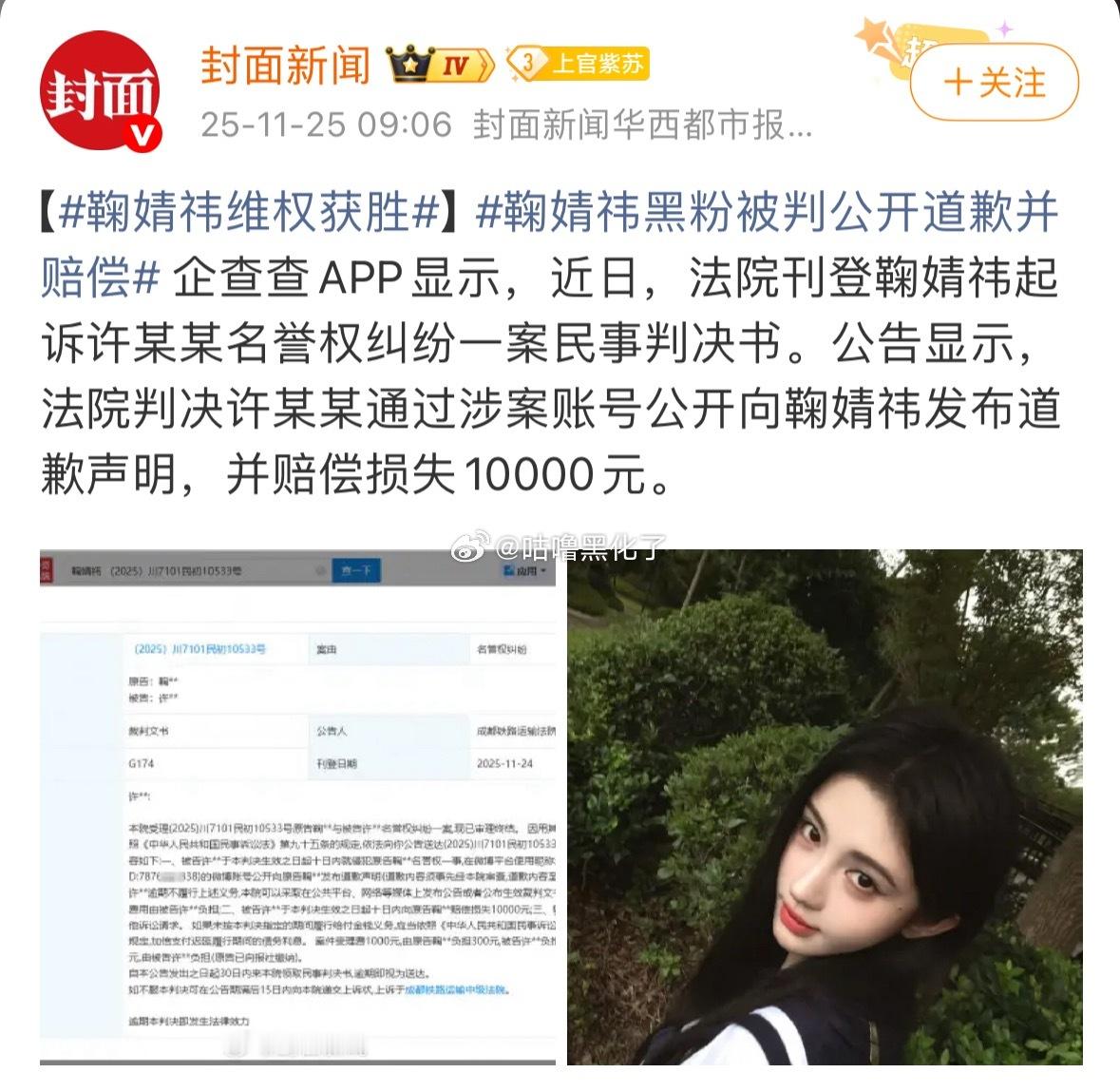 鞠婧祎维权成功了,黑粉道歉并赔偿,支持🍊姐维权!