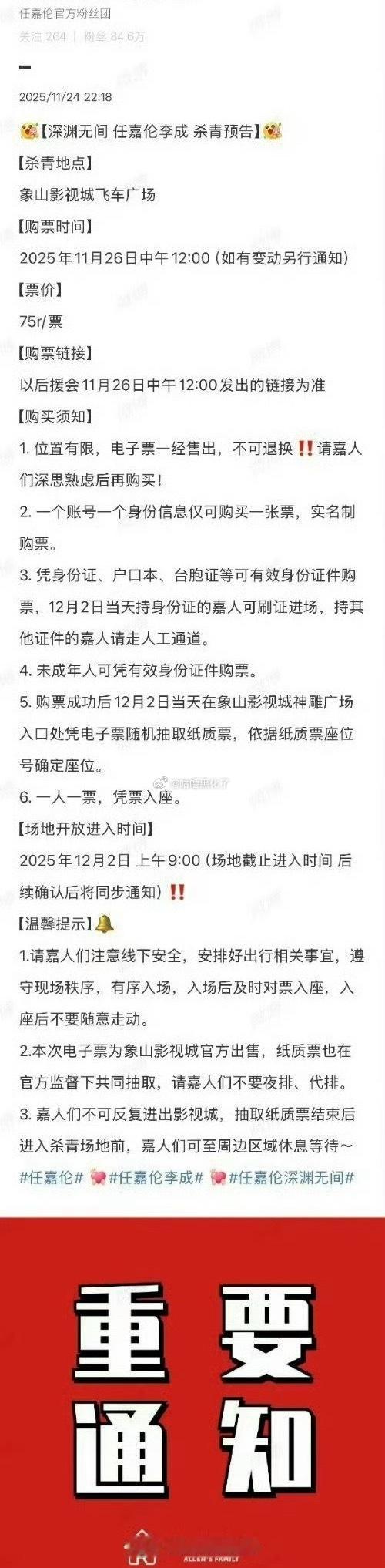 任嘉伦宠粉这块儿真没得说,深渊游戏要杀青了,提醒粉丝不要提前购买影视城门🎫,并