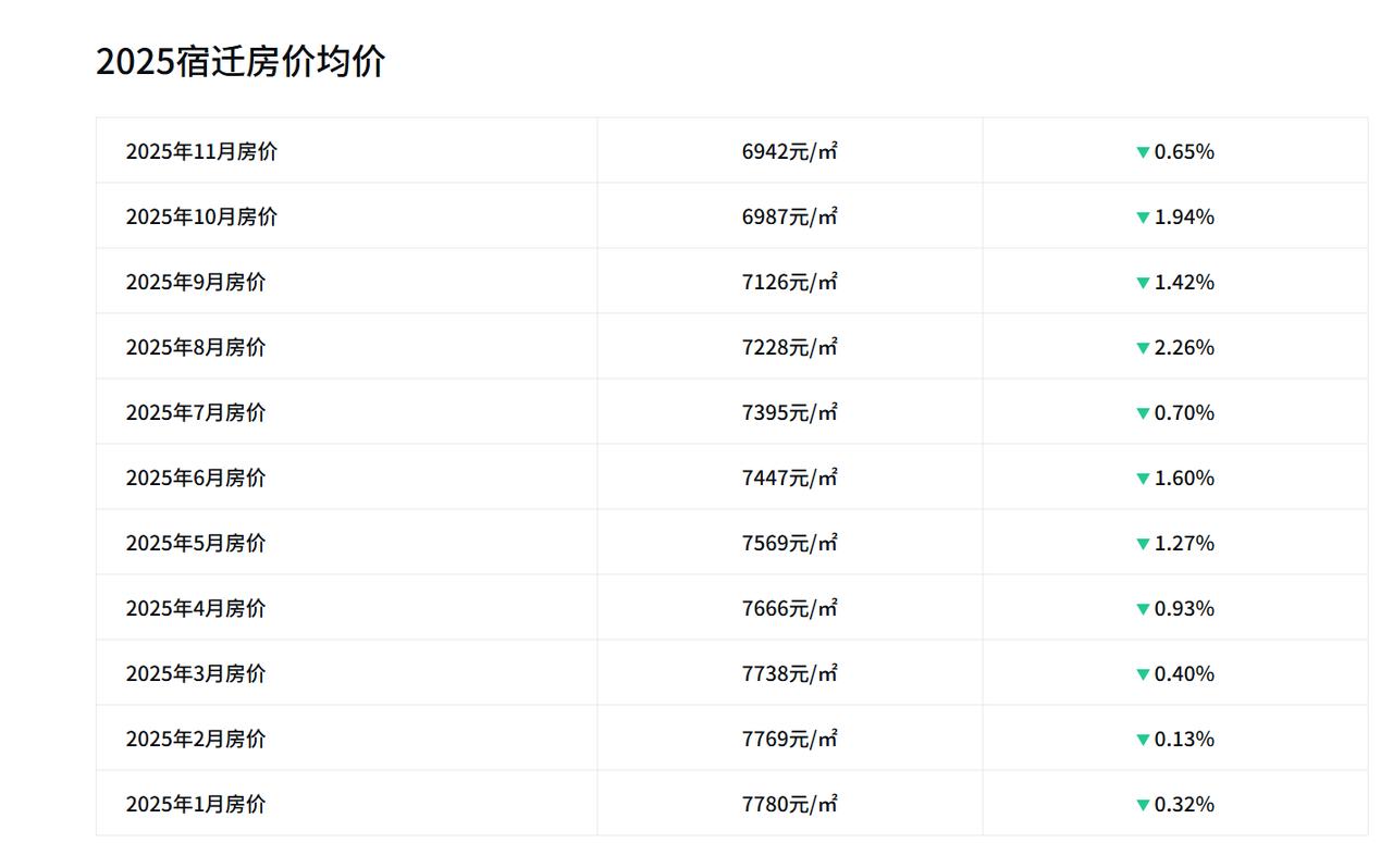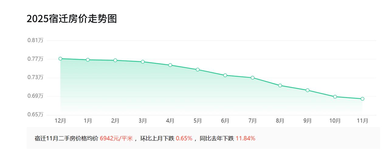 2015年10月,宿迁房价均价5423元; 2016年10月,宿迁房价均价5020元; 2017年10月,宿迁房价均价6643元; 2018年10月,宿迁房价均价7989元; 2019年10月,宿迁房价均价8500元; 2020年10月,宿迁房价均价9727元; 2021年10月,宿迁房价均价11115元; 2022年10月,宿迁房价均价10270元; 2023年10月,宿迁房价均价9641元; 2024年10月,宿迁房价均价7975元; 2025年10月,宿迁房价均价6987元。 数据说明:以上均价数据,均来自安居客数据,只是作为数据分析的参考,旨在反映芜湖房价近十年的走势,不能准确映射当地实际房产价格。因为新房、二手房、不同区域不同位置的房价差别较大,占比也不同,仅通过一个均价不能一概而论。下面漫心r就把整理出来的数据进行一个初步的分析,和大家分享一下感受: 一套房,十年间,价格起伏的背后是无数家庭的财富故事,“狠拼五年,工资还是没跑过宿迁房价……”这是2021年一位本地网友发出的感叹。回想2015年,宿迁新房市场大多还处于5、6千的价位,当时买房还算不上有太大的压力。 随着2016年出台的购房补贴政策,买房可以说是遍地捡便宜。十年过去,优惠早已不再,宿迁楼市也上演了一轮过山车行情。 纵观宿迁房价十年的数据,一条清晰的“上升-见顶-回落”曲线呈现在我们面前。从2015年开始,踏上了长达六年的上涨行情。2017年,宿迁房价便出现跳涨,随后几年,宿迁房价一路飙升,2020年逼近万元,到2021年,宿迁房价终于站上历史顶峰,均价达到11115元,相比2015年涨幅超过100%,实现了房价翻倍,当时提前买房的人可谓是躺赢了。 然而,顶峰之后,等待人们的不是继续上涨,而是连续四年的回调。 2022年,宿迁房价开始回落,2023年进一步下跌,几乎回到了2018年的水平。根据最新数据,2025年10月宿迁房价均价为6987元,较最高点已下跌约37%。 宿迁楼市整体下行的背后,不同区域的表现也大相径庭,主要原因是配套资源的稀缺性,包括地段、学区、生活便利等多重因素叠加。 写在最后,从政策、经济、人口等方面综合考虑,宿迁楼市短期内可能仍然处于调整阶段,回头看这十年,宿迁房价经历了辉煌和沉寂,下一个十年,宿迁楼市或将告别大涨大跌,回归居住的本质。