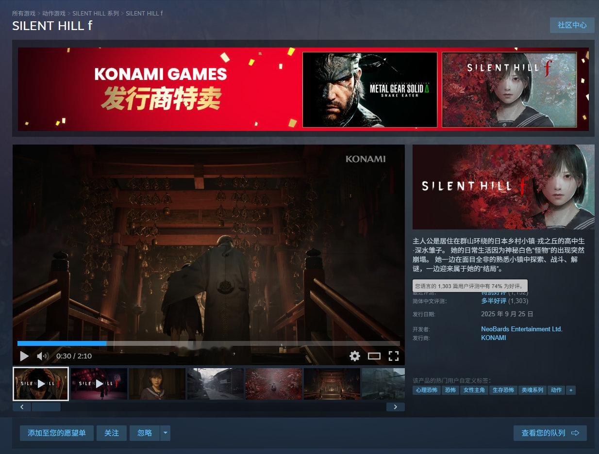 心理恐怖游戏《寂静岭f》目前在平台开启首次打折,标准版折后312.8元,豪华版折后356.8元,12月9日截止,支持中文,国区好评率为74%,收录超1300篇玩家评测。主人公是居住在群山环绕的日本乡村小镇·戎之丘的高中生·深水雏子。 她的日常生活因为神秘白色“怪物”的出现突然崩塌。她一边在面目全非的熟悉小镇中探索、战斗、解谜,一边迎来属于她的“结局”。