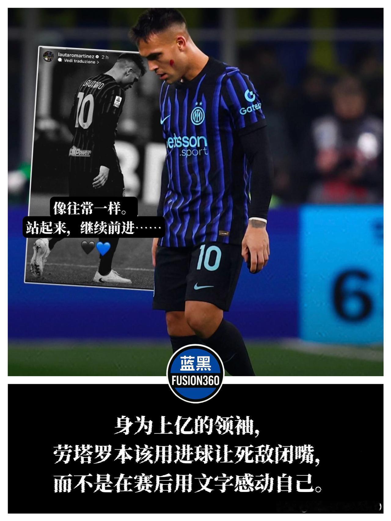 惨败后只剩鸡汤?劳塔罗打破沉默:这几个字掩盖不了软弱 德比的硝烟散去,梅阿查的伤口还在淌血,我们的队长却选择在社交网络上“疗伤”。在全队被米兰按在地上摩擦之后,劳塔罗更新了社交媒体,配图是一张充满文艺气息的腿部特写,配文极其简练:“像往常一样。站起来,继续前进……” 这是阿根廷人在兵败后首次公开回应。在漫天的质疑声中,他试图用这句标准的“心灵鸡汤”来安抚人心。但在竞技体育残酷的记分牌面前,这种键盘上的坚强显得如此苍白无力,甚至透着一丝推卸责任的圆滑——毕竟在场上隐身的是他,赛后找补的也是他。 作为身价上亿的领袖,劳塔罗本该用进球让死敌闭嘴,而不是在赛后用文字感动自己。球迷厌倦了这种“虽败犹荣”的表演,队长袖标承载的是血性,绝不是公关文案。 赢球靠脚,输球靠嘴。如果下一场还是软脚虾,这碗鸡汤你还喝得下去吗?国际米兰 💙🖤