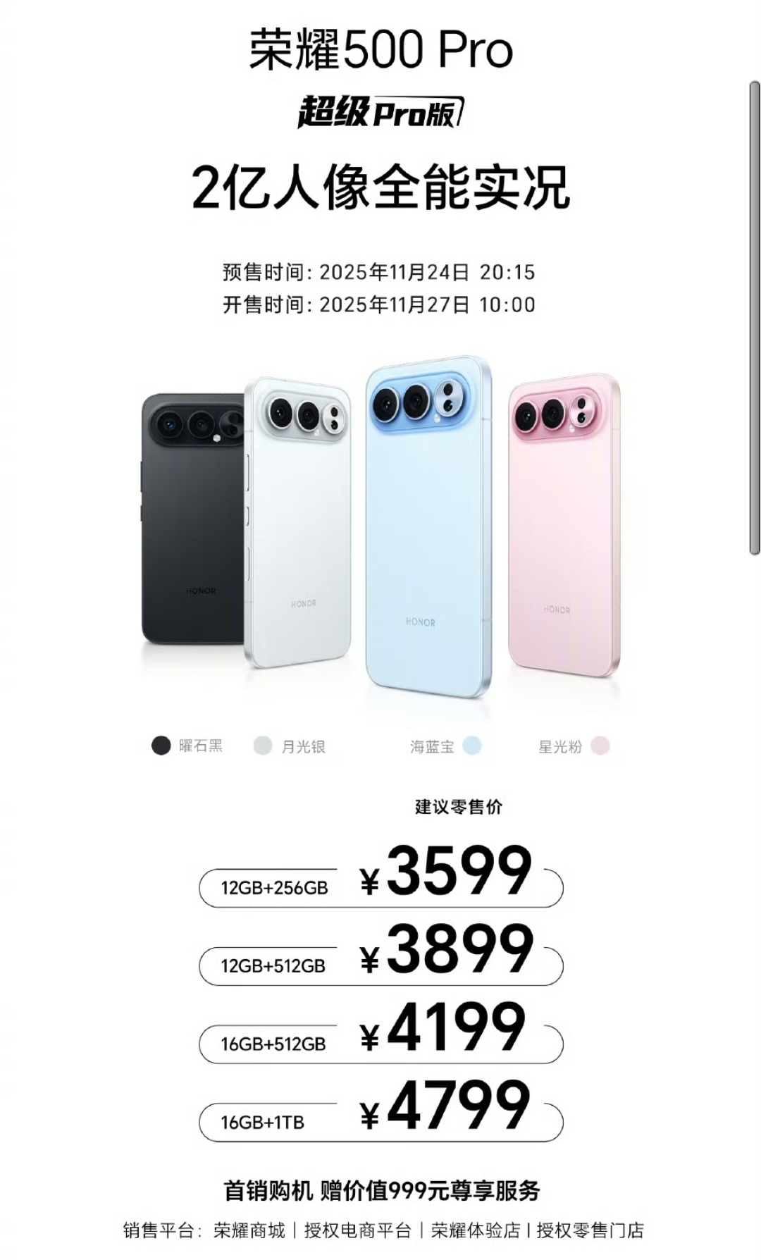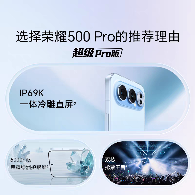 荣耀500 Pro发布,3699元起!1.处理器:高通骁龙8至尊版!2.屏幕:6.55寸AMOLED直屏,120Hz刷新率,3840Hz PWM调光!3.影像:前置5000w,后置2亿主摄+1200w超广角微距+5000w长焦!4.续航:8000mAh+80w有线快充+50w无线快充!5.其他:MagicOS 10,红外、NFC、Z轴线性马达,3D超声波指纹,自研射频增加芯片C1+,IP68/69/69K防尘防水,海蓝宝、星光粉、曜石黑、月光银四色,12+256GB 3599元起!