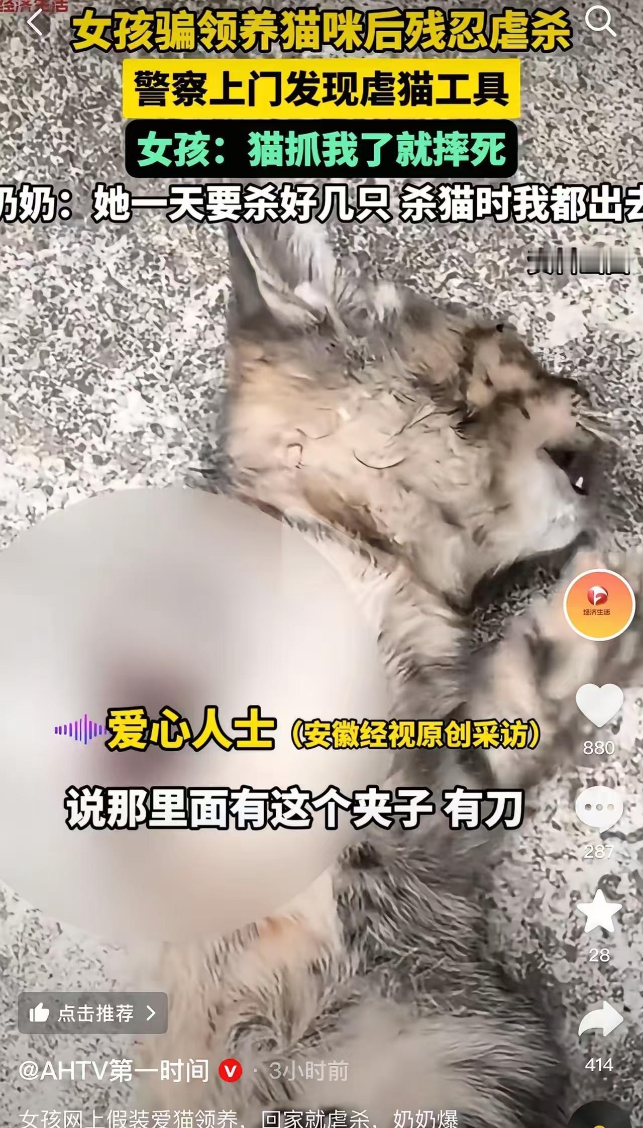 太残忍了!山东菏泽,一女孩在网上假装喜欢猫来骗领养,结果回家后就虐杀,她奶奶称,一天就要杀好几只,行为疯狂令人发指! 本地救助群近期频繁出现送养猫咪“失联”情况,爱心人士追查发现,所有猫咪都被菏泽一名二十出头的女孩领养。她在群里伪装成爱心人士,发喂流浪猫照片博取信任,顺利领养多只猫咪。 一名送养人接到邻居电话,称女孩家阁楼传来半小时猫叫后没了动静。送养人赶去追问,女孩神色慌张锁阁楼门,其奶奶随口透露“这孩子一天杀好几只,拦不住”,让在场人脊背发凉。 消息传开后,救助群和本地论坛炸锅。网友扒出女孩社交账号,发现她和其他虐猫者交流“心得”,还发隐晦虐猫视频称“解压”。爱心人士找她讨说法,她竟称“领养的猫想怎么处理就怎么处理”,邻居也吐槽半夜被猫叫惊醒,常看到她扔猫尸塑料袋。 这种骗领养虐杀行为并非个例,全国曾多次出现类似案例,但目前缺乏有效法律约束,虐猫者仅受道德谴责,钻法律空子践踏生命。领养机制也有漏洞,救助机构靠“看人品”筛选,难防别有用心之人。 我认为,女孩行为是心理扭曲,还利用他人善意,必须完善监管让虐猫者付出代价,否则更多小动物遭殃。 各位读者你们怎么看?欢迎在评论区讨论。