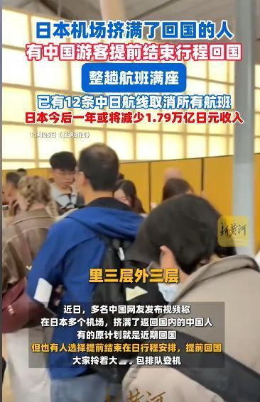 活该被滞留,中日航班十二条线停航,一些不听劝阻的旅日游客被滞留小日子机场急的团团转。 11月24日,当天12条中日航线突然宣布停航,数百名赴日游客瞬间陷入滞留困境。 日本关西国际机场的候机大厅里,空气里弥漫着焦灼的气息。 几位游客围在航司服务台前,手里攥着早已过期的登机牌,反复询问着复航信息。 角落里,一对年轻夫妻正低声争执,行李箱上堆着吃剩一半的便当,孩子趴在妈妈怀里哭闹不止。 这场滞留的伏笔,早已埋下,日本首相高市早苗公开发表涉台挑衅言论,将“台湾有事”与日本“存亡危机事态”强行绑定,暗示可能武力介入台海问题。 这番言论不仅违背《中日联合声明》等一系列政治文件精神,更创下战后日本领导人的三个“首次”,彻底打破了中日关系的平衡。 面对如此突破底线的挑衅,中方迅速作出回应:11月14日至16日,外交部、文旅部、驻日使领馆等多部门连续发布预警,明确建议中国公民近期避免赴日旅游或留学。 国内多家航司也同步开通免费退改通道,为已购票游客提供规避风险的机会。 彼时,不少游客选择取消行程,但仍有部分人抱着“风险不会落到自己头上”的侥幸心理,坚持按原计划出行,将个人旅游偏好置于官方风险提示之上。 而11月24日的航线停航,正是这种紧张关系的具象化体现,并非单一航司的临时调整,而是全行业的系统性收缩。 据航班管家数据显示,当天名古屋、福冈、札幌等多地往返中国的12条热门航线全部停航,天津滨海至关西国际、南京禄口至关西国际等航线的取消率分别高达65%和59.4%。 国航、东航、吉祥航空等十余家主流航司同步跟进,要么削减航班班次,要么关闭部分航班预订通道,原本密集的中日航线网络瞬间收紧。 航线供给的大幅收缩,直接将滞留游客推向了困境的核心:返程机票成了稀缺资源,春秋航空部分航线票价较平日飙升近三倍。 即便如此,游客仍需在机场排起数小时的长队争抢名额;住宿、餐饮等临时开销也水涨船高,有游客核算,滞留三天的额外支出已超过原本的往返机票费用。 更让一些游客心寒的是,此前在日本景区遭遇的隐性歧视此刻愈发清晰。 有游客回忆,曾在大阪某药妆店遇到同款面膜售予中国人的价格比本地人高20%,如今滞留困境中,部分商家的冷漠态度更让这份旅行体验雪上加霜。 机场里的焦灼,也蔓延到了网络舆论场,社交平台上,观点呈现出鲜明的分化:有人晒出官方预警截图感慨“不听国家劝,吃亏在眼前”,认为游客的滞留是忽视风险的必然结果。 也有网友呼吁理性看待,觉得“旅游选择不该与爱国捆绑,滞留者的困境值得同情”。 但官方预警不是限制自由的枷锁,而是基于全局信息给出的安全指引,忽视这份指引,本质上是对自身安全的不负责任。 随着部分中转航班的开通,滞留游客正陆续返程,关西机场的长队也渐渐缩短,但这场风波留下的警示却值得长久深思。 旅行的本质,是为了获得愉悦与成长,而非陷入被动与焦虑,个人选择的自由固然珍贵,但自由的边界永远是对风险的敬畏。 无论是国际出行还是国内游玩,重视官方提示、理性评估风险,从来都不是对自由的束缚,而是让旅行真正回归本质的保障。 当我们在规划行程时,若能多一分对风险的考量,少一分侥幸心理,平衡好个人喜好与安全底线,或许才能让每一段旅程都走得更安心、更从容。