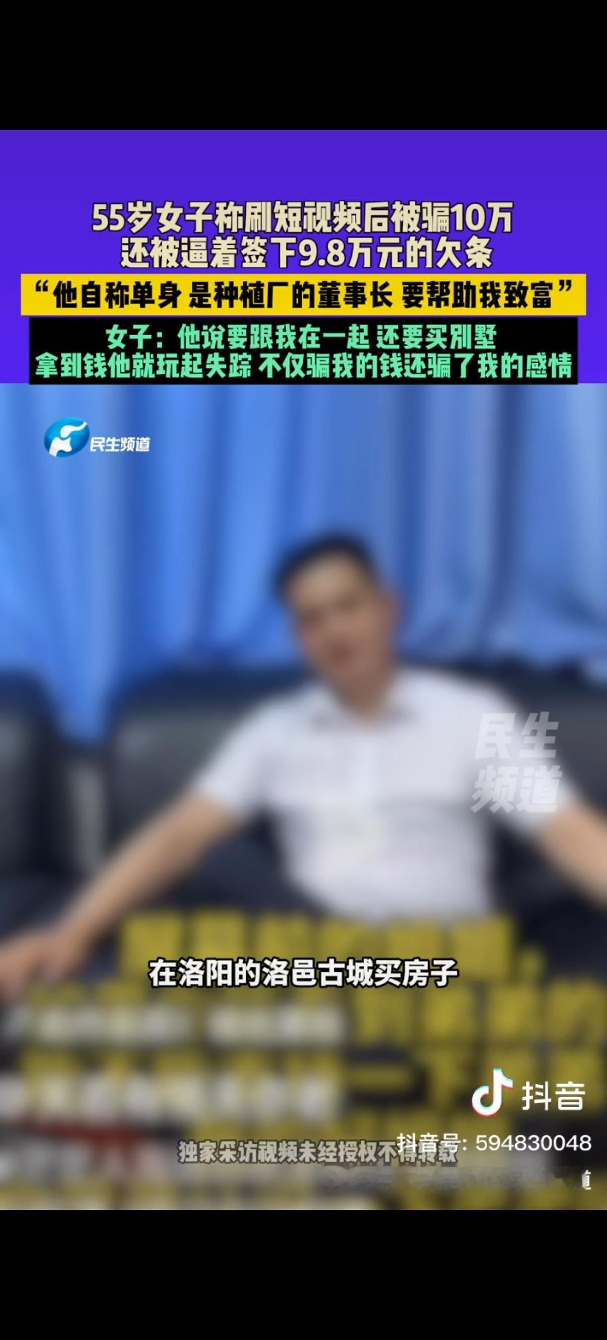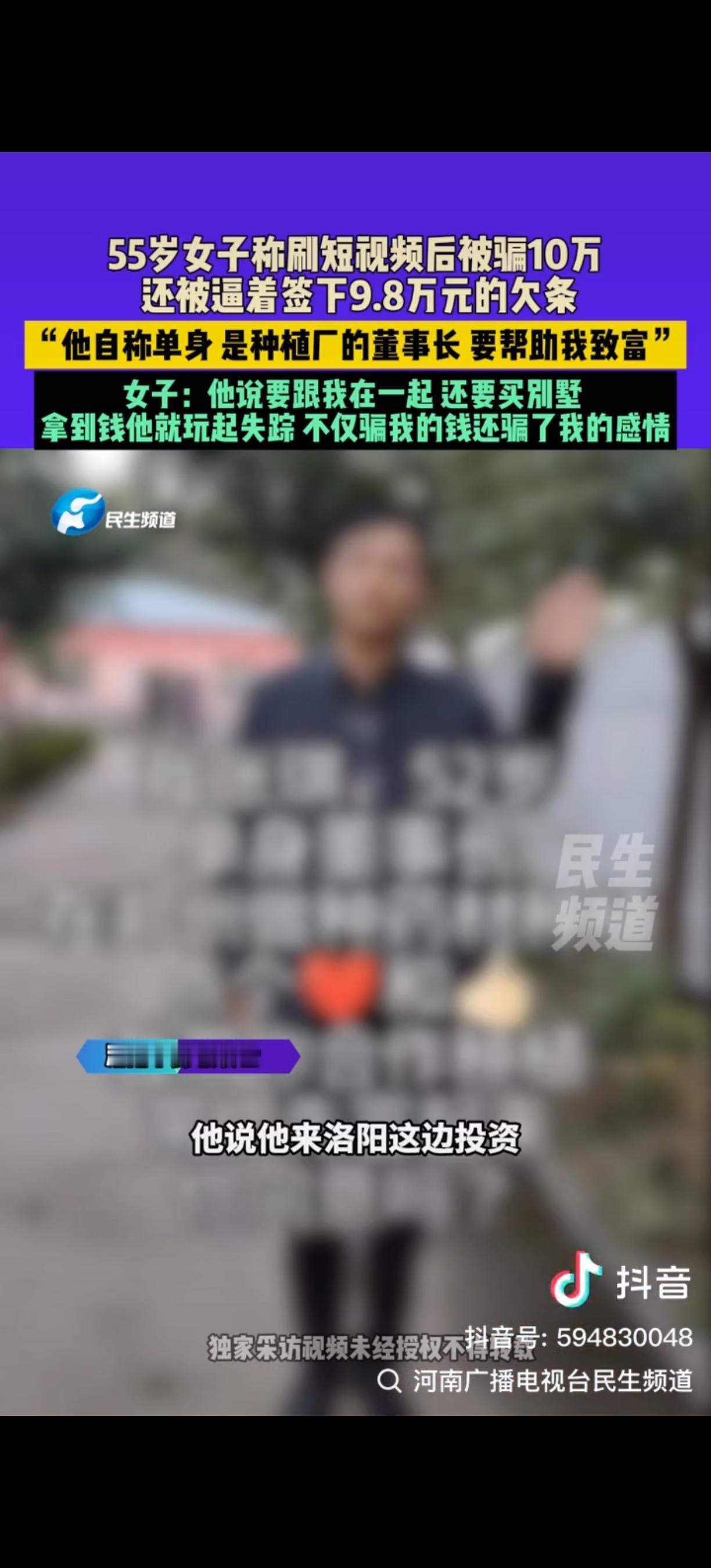 河南洛阳,55岁女子被男子骗到宾馆开房,他对女子说,我喜欢你,女子信以为真,给他转520红包,还拿300现金给他买短袖。之后男子又以“项目周转”为由,跟女子拿了10万1千元。没想到,钱一到账,男子就彻底失联。女子这才意识到被骗,哭着向媒体求助:他说他是公司董事长,穿的都是名牌,说的话那么真诚,我完全信了。 张女士平时喜欢刷短视频,某天刷刷到一个自称是种植厂董事长的男士,对方谈吐不凡,当晚就加了她微信。聊了没几天,对方就邀请张女士去参观他的基地,结果却把她带到了一家宾馆,还让她自己开房。 一进宾馆,这位“董事长”就说喜欢张女士,还说自己5月21日生日。张女士被这突如其来的“爱意”冲昏了头,5月20日给对方转了520红包,又拿300块现金给他买短袖,甚至之前还给他买过内衣。 没过多久,“董事长”开始说自己有个铁皮石斛的项目,能帮张女士致富,还拿出一份购销合同让她签。张女士想着能打份工挣点生活费,就把自己攒的10万1千元给了对方。 可钱一到手,这位“董事长”就彻底失联了。张女士这才明白自己是被骗了,那些名牌是假的,董事长身份也是编的,所谓的项目和合同全是骗局。更让她崩溃的是,她还被逼着签下了9.8万元的欠条。 被骗后,张女士一个人走在街上,感觉无处可去,就像个乞丐。她怎么也想不通,自己真心相待的“董事长”,竟是个彻头彻尾的骗子。骗子不仅骗了她的钱,还骗了她的感情,曾说要在洛阳投资,和她在一起,还要在洛邑古城买别墅。这些甜言蜜语,现在想来都像针一样扎人。 现在,张女士只想提醒全国各地的女性朋友,千万别像她一样轻信陌生人。网上那些自称单身、是厂长或董事长,以农业种植快速致富为名的人,很可能都是骗子。大家在网上交友、投资时,一定要多留个心眼,别让骗子的花言巧语骗了感情,又骗了钱财。 各位读者你们怎么看?欢迎在评论区讨论。 来源:河南广播电视台民生频道 2025-11-24发布