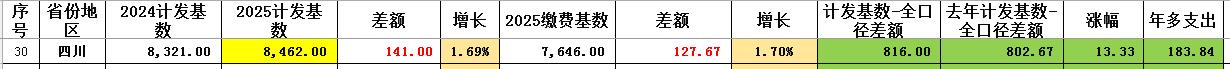 四川省2025年计发基数是8462元吗? 四川省2025年计发基数大概率是不公开的,这也是符合流程的。 计发基数的文件可以公开,也可以不公开直接使用,如个人需要,可以申请公开。 四川2025年计发基数是8462元的可能性非常大。 因为缴费基数增长了1.7%,按照这个比例,计发基数增长不会超过1.7%,也就是增长141元,达到8462元。 今年计发基数涨幅大于缴费基数涨幅的,只有广东和湖北武汉。 四川两个基数2024年是差额为802.67元,如果计发基数是8462元,差额会增加到816元。 8462元!基本就是四川2025年计发基数上限了。