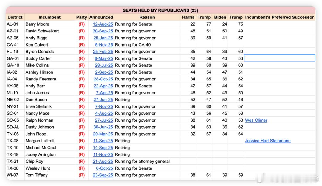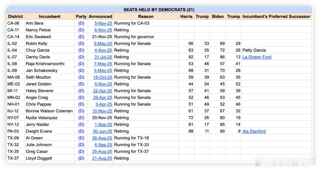 春江水暖鸭先知,国会议员们的去向透露出的信息随着本周Mikie Sherrill(D-NJ-11)辞职为就任新泽西州州长做准备,共和党在众议院的多数席位变成了R219-D213(三个空缺席位)。到目前为止,共有23名共和党联邦众议员将不会出现在下届众议院,其中11人寻求竞选州长。另有6人转而竞选联邦参议员。本届任期结束后不竞选连任也不竞选其他职务,即“真正退休”的只有四人。(圖一)再来看民主党的这边,共有21人(圖二),其中转而竞选州长的只有前天刚宣布的Eric Swalwell(D-CA-11)一人。转而竞选联邦参议员的民主党人共有6人。曾“打断”Trump国情咨文被驱逐的Al Green(D-TX-9)等4人,因选区重画变更选区竞选连任,真正退休的民主党人多达9人,是共和党退休人数(4人)的两倍多,一般情况下,中期选举的竞选环境有利于在野党,然而却有如此之多的民主党人选择退休,可见笼罩在民主党头顶的悲观情绪相当严重,只是主流媒体很少报道而已!即使共和党再加上中途离职的MTG和Mark Green,民主党选择退休的人数仍多于共和党,这在有利于民主党的中期选举环境里,属于不正常状况。综合以上,相对于民主党人,共和党人更加地“斗争昂扬”,追求“更高职务”(参议员或州长)的人数多于民主党;面对不利于己的中期选举环境,退休人数也少于民主党,由此也可观察出两党各自的内部氛围如何,毕竟春江水暖鸭先知。