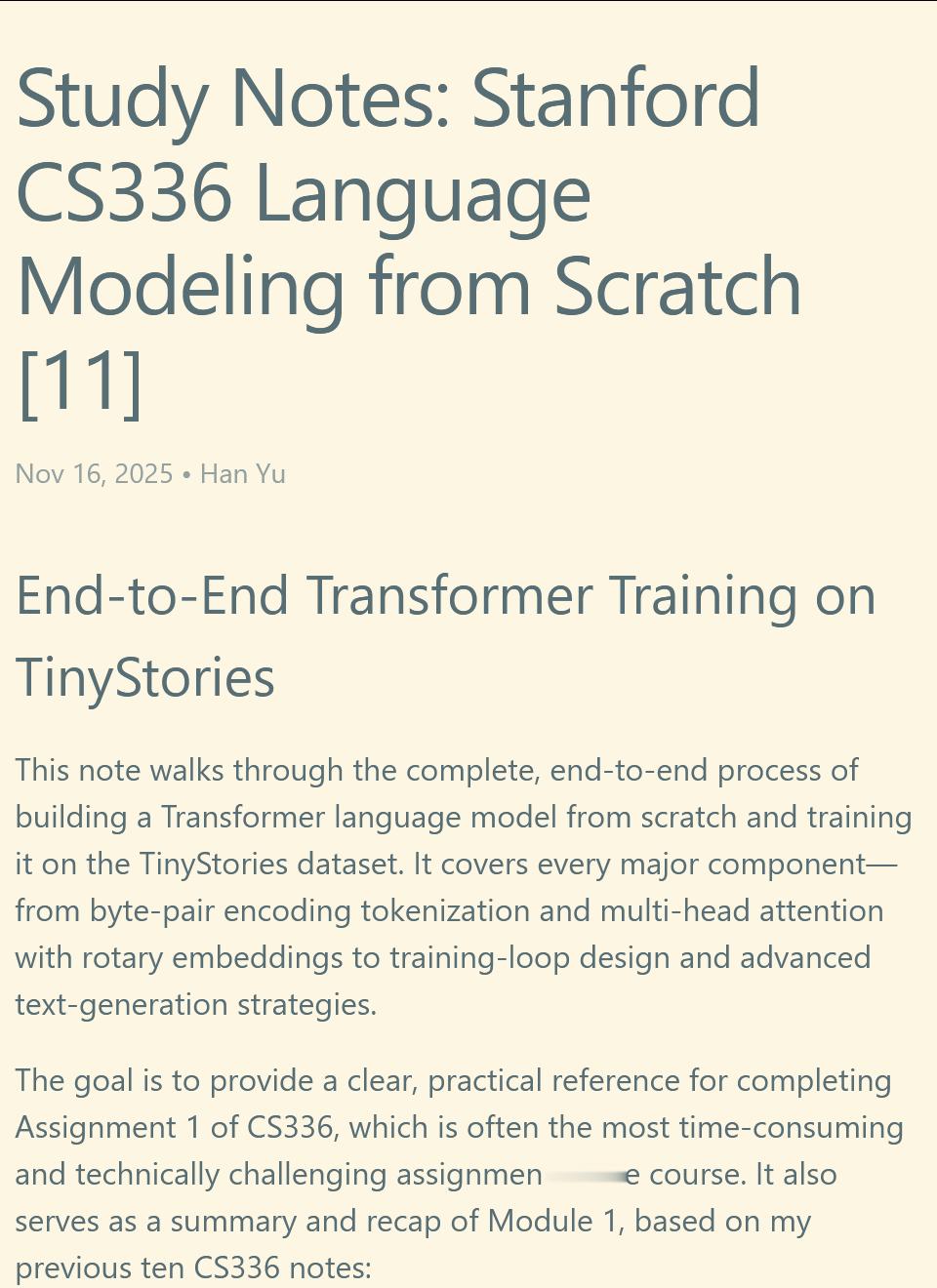 一份 Stanford CS336,从头构建大语言模型的课程笔记bearbearyu1223.github.io/cs336/2025/11/16/cs336-the-complete-experiment-for-tinystories-transformer.html本文详细介绍了从零开始构建一个Transformer语言模型并在TinyStories数据集上进行训练的完整过程。内容涵盖了每个主要组件——从字节对编码分词和旋转嵌入的多头注意力机制,到训练循环设计和高级文本生成策略。本笔记的目标是为完成CS336的第一项作业提供清晰、实用的参考,通常这项作业是课程中最耗时且技术挑战最大的作业。