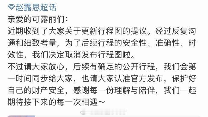 赵露思方面为了安全性和时效性,决定取消发布行程图了。