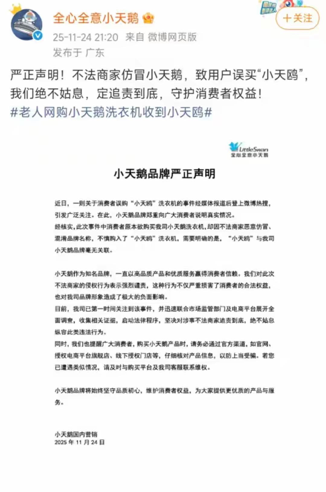 老人网购小天鹅洗衣机收到小天鸥洗衣机! 小天鹅电器发布严正声明:将追责到底! 老人是奔着小天鹅的名气去的,而且这个价格确实便宜只需要405元,结果收到货之后发现这个洗衣机叫做小天鸥,目前该商品已经被投诉下架。 小天鹅电器看到此消息之后发布了严正声明,不法商家仿冒小天鹅,我们将追责到底,守护消费者权益。 其实在网络平台经常会出现这种情况,有的时候为了省一点钱,会选择价格稍低一点的店购买,特别是有些logo是拼音,但是中间的字母不一样,很容易吃亏上当。 大家都吃亏上当过吗?欢迎评论区留言。