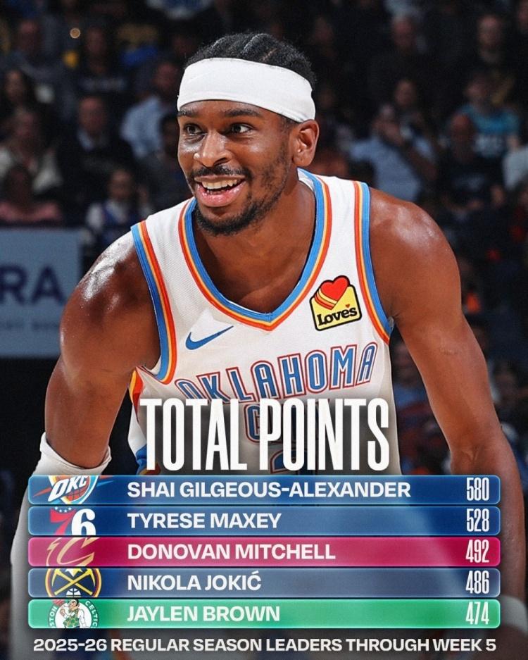 NBA新赛季开赛五周了你知道谁是场均得分王和总得分王吗? 总得分王是雷霆的亚历山大砍下580分! 场均得分王是湖人东契奇场均34.5分。 场均得分第二名:马克西33分。 场均得分第三名:亚历山大32.2分。 总得分第二名:马克西528分。 总得分第三名:米切尔492分。 NBA实力榜 nba实力榜 NBA球星榜 亚历山大大满贯 NBA 球星榜 nba最终排名 NBA赛程密度