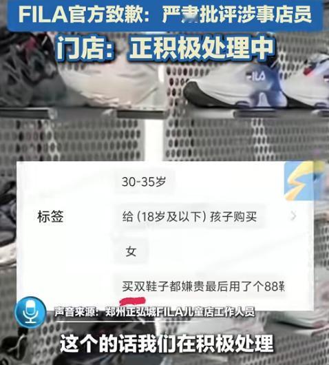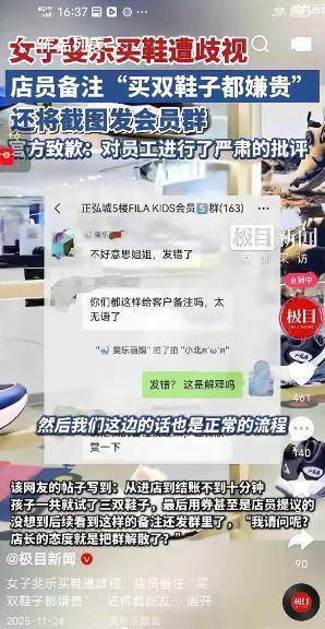 这下真是出名了!不仅郑州人,全国人民都知道了。 女子在郑州斐乐门店买了双鞋子,竟然被店员备注:买双鞋子都嫌贵。但该女子是带着孩子来门店买鞋子,从进门到结账只用了十分钟,并且只试了三双鞋。 说白了,现在当个消费者可太不容易了,买双鞋花了钱还得被店员在背后戳脊梁骨,郑州这位女士的遭遇,简直把 “花钱买气受” 这事演绎到了新高度! 事情说起来也简单,郑州一位女士带着孩子去斐乐门店买鞋,从进门到结账前后就十分钟,也就试了三双鞋,结果转头就被店员备注上了 “买双鞋子都嫌贵”。 这事一曝光,不光郑州本地炸开了锅,全国网友都跟着替这位女士抱不平,你说这叫什么事啊?现在去实体店买东西,难道还得先向店员证明自己 “买得起” 才行? 全网不少人都在聊类似的经历,有人说去某些品牌店,店员看你穿得普通,连话都懒得跟你说,更别说主动介绍产品了。 还有人说试过明明很喜欢某件衣服,就因为多问了两句折扣,店员那眼神立马就变了,话里话外都是 “嫌贵就别买” 的意思。咱就纳闷了,谁买东西不嫌贵啊? 我活这么大,就没见过有人买东西的时候说 “哎呀这个东西真便宜,再给你加点钱吧”,要是真有这种人,估计大家还得以为他有啥问题呢。 而且我实在不理解那些销售嫌顾客穷是啥心理,自己每个月挣那仨瓜俩枣的,也就够维持个基本生活,怎么就有脸暗地里瞧不起客人呢? 这就跟困螃蟹的绳子似的,天天跟螃蟹待在一块,就真觉得自己也能卖螃蟹那价格了?太可笑了吧! 那些店员无非就是在品牌店里工作,天天接触些价格高点的商品,就真把自己当 “上流人士” 了? 好像自己卖的东西贵,身价就跟着水涨船高一样,可事实上呢?说不定她自己和自己的孩子,平时还真未必穿得起店里的鞋呢! 就拿郑州这位女士的事来说,她十分钟买完鞋,说明目标明确、不耽误时间,这明明是很爽快的顾客,结果却被店员背后贴标签,要是这位女士没发现这个备注,说不定下次还会去这家店消费,可现在呢? 不光她自己肯定不会再去了,她身边的亲戚朋友、看到这事的网友,估计也会对这家斐乐门店心生抵触。 店员这随手一笔,看似是发泄了自己的 “优越感”,实际上却是砸了门店的生意,不知道门店负责人知道了,会不会后悔雇了这么个 “猪队友”。 而且说句实在的,现在消费者买东西,看重的可不光是商品本身,服务态度也占了很大一部分,同样的牌子,同样的价格,谁愿意去那种店员看人下菜碟的店里消费啊? 大家花钱是为了图个开心、图个方便,不是去看店员脸色、听那些阴阳怪气的话的,要是连最基本的尊重都给不了顾客,那这生意也别想长久做下去。 这事之所以能引起这么多人的共鸣,就是因为不少人都有过类似被 “嫌弃” 的经历,大家不是为了替这位女士出头,更多的是在为自己发声,我们作为消费者,希望得到的是平等、尊重的服务,而不是被店员用 “买不买得起” 来划分三六九等。 以上内容仅为个人看法,大家对郑州斐乐店员备注顾客 “买双鞋子都嫌贵” 这事有啥想法?你有没有遇到过类似的消费经历?欢迎在评论区聊聊你的感受。