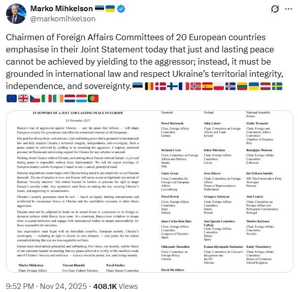 欧洲20国议员联合警告特朗普 美国日前和俄罗斯进行了秘密谈判,之后抛出结束俄乌战争的28点计划,里面的很多内容对乌克兰不利,引发乌克兰和欧洲的强烈不满,欧洲20国议员联合发表声明,向特朗普政府发出警告。 爱沙尼亚议会外委会主席马尔科・米克尔森(Marko Mihkelson)11月24日在社交媒体X上发文说:“20个欧洲国家的外交事务委员会主席今天发表联合声明,强调公正持久的和平不能通过向侵略者屈服来实现;相反,它必须以国际法为基础,并尊重乌克兰的领土完整、独立和主权。” 他还公布了联合声明的全文。声明称,俄罗斯对乌克兰发动的侵略战争——以及之后的和平——将影响未来几代人的欧洲安全,并关乎所有欧洲人的生存利益。“我们的目标始终是,并将继续是,在国际法的基础上,实现公正持久的和平,充分尊重乌克兰的领土完整、独立和主权。向侵略者屈服或给予其奖励都无法实现这样的和平,任何解决方案要想成功,都需要对俄罗斯施加持续的压力,并对乌克兰给予坚定不移的支持。” 声明还说:“没有乌克兰参与,就无法讨论乌克兰问题;没有欧洲参与,就无法讨论欧洲问题。没有这些基本要素,公正持久的和平就无从谈起。我们呼吁欧洲各国领导人和欧洲理事会紧急召开会议,采取团结一致、秉持原则的立场。真正的谈判不能以要求乌克兰首先就要接受俄罗斯的要求为开端。帝国时代已经结束,欧洲绝不会接受任何俄罗斯超出其边界的‘安全利益’概念,也不会接受任何俄罗斯自诩有权塑造欧洲安全秩序的说法。任何协议都必须聚焦于结束战争、保障乌克兰的未来以及支持其重建。” 声明还强调,乌克兰的安全保障必须切实有效,以具有法律约束力的承诺为基础,并由驻乌克兰的安保力量和必要的威慑能力加以强化,以阻止未来的侵略。在俄罗斯不受到限制的情况下,乌克兰的武装力量也不应受到限制,其内外政策也不应受到约束。至少,俄罗斯必须从占领区撤军,并与国际机构合作,确保追究暴行责任人的责任。 声明指出,任何谈判都必须以立即停火为前提。欧洲安全、乌克兰主权(包括其自主选择盟友的权利)以及对战争期间所犯罪行的公正审判,都是不容谈判的底线。欧洲必须团结一致,坚持原则毫不动摇。我“们的价值观、我们的安全以及我们大陆的未来,都取决于确保最终达成的和平能够配得上乌克兰人民所作出的牺牲以及他们展现出的勇气和韧性——一个植根于正义、法律和持久安全的和平。” 相关阅读: 特朗普结束俄乌战争28点和平计划全文曝光