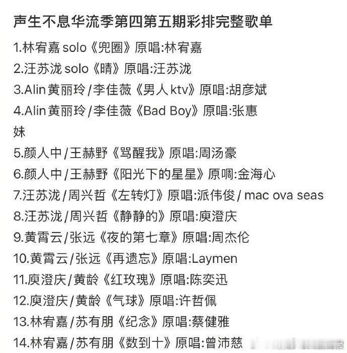 《声生不息华流季》四五期彩排歌单出炉!黄丽玲李佳薇飙唱《BadBoy》,风格相近歌手组队碰撞火花~