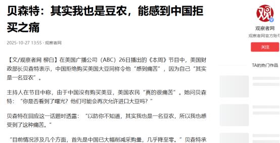 美国“子弹”已上膛,美财长通知中国交出稀土!话音刚落,中方停购大豆...... 最近中美之间的贸易博弈又添了新戏码,美国财长贝森特在福克斯新闻的“周日早间期货”节目里一番强硬表态,直接把稀土和大豆这两种八竿子打不着的商品绑在了一起。 这位刚上任没多久的财长对着镜头语气一点不绕弯,明说要求中国必须在感恩节之前敲定稀土供应协议的细节,还撂下狠话称要是不履行承诺,美国“所有选项都可用”。这番话一播出,全球市场都炸了锅,谁都看得出来,这哪里是协商,分明就是下最后通牒。 要知道美国为啥这么急着要稀土,得先搞明白这东西的分量。稀土不是普通的矿产,手机屏幕、风力涡轮机都得用,更关键的是军工领域,导弹制导系统、隐形战机涂层这些核心部件都离不开它。 而中国在全球稀土供应链里的地位有多稳?多年来一直掌握着核心的冶炼加工技术,全球大部分稀土产品的供应都得看中国脸色。美国这些年一直想摆脱依赖,可本土稀土加工产业早就断了档,就算有矿也没法高效提炼,短期内根本离不开中国的供应。 贝森特敢这么硬气,背后其实有个协议当由头。就在10月底,特朗普和中方在韩国釜山的会晤上刚达成一个贸易框架协议,里面确实提到中国暂停稀土出口控制一年,美国则暂停部分关税威胁,中国也承诺恢复购买美国大豆。 可协议里明明说的是“协商敲定细节”,到了贝森特嘴里就变成了“必须按时交出来”,这种居高临下的态度,明摆着没把协商当回事。更有意思的是,他还在采访里否认中国要限制稀土磁铁出口给美国军工企业的传闻,嘴上说着不信,行动上却急着下通牒,足见美国有多心虚。 面对这通赤裸裸的威胁,中国这边没像美国那样咋咋呼呼开新闻发布会,也没说一句狠话,可手上的动作却一点不含糊——直接停了美国大豆的采购。 要知道大豆可是美国农业的命脉之一,而中国又是全球最大的大豆买家,过去美国每年有大量大豆要靠卖到中国才能消化。 釜山会晤前,中国国企刚发出过采购订单,结束了好几个月的中断,当时美国农场主还挺高兴,以为苦日子要熬出头了。结果会晤刚过没多久,进入11月,采购就突然踩了刹车。 美国农业部的数据一出来,更能看出这波停购的力度有多猛。从峰会结束到11月中旬,中国总共就买了两笔美国大豆,加起来才33.2万吨,这跟之前的采购量比起来几乎是腰斩,远低于美国农业界的预期。 更要命的是,今年美国大豆收成还是二三十年来最高的之一,一边是卖不出去的海量库存,一边是突然消失的最大买家,美国农场主直接陷入了“完美风暴”。芝加哥期货交易所的大豆价格跟着波动,库存积压到了多年高点,不少农民都开始慌了,不知道这些大豆要砸在自己手里多久。 这时候大家才发现,贝森特自己居然也是个豆农。这位华尔街出身、净资产高达6亿美元的财长,在北达科他州持有价值2500万美元的玉米和大豆农田,每年光租金就能赚上百万美元。 而北达科他州约70%的大豆都要出口到中国,中国停购的消息传来,他自己也得跟着心疼。后来在ABC的《本周》节目里,他被问到美国农民的困境时,不得不承认“自己也感受到了这种痛苦”,这话听着多少有点讽刺——毕竟当初放狠话的是他,现在被反制疼到自己的也是他。 中国敢这么硬气停购,底气其实早就攒足了。一方面是国内大豆库存充足,短期内不用急着进口。 另一方面是早就找好了替代来源,巴西今年大豆丰收,中国直接把采购订单转向了南美。那段时间,中国港口里来自巴西的大豆船越来越多,美国大豆却只能躺在仓库里。 更关键的是,之前中国海关在进口美国大豆里检出过麦角和种衣剂,早就暂停了CHS Inc.等3家涉事企业的输华资质,本来美国大豆进入中国市场的门槛就高了,现在又没了新订单,处境更是雪上加霜。 美国这边也没坐以待毙,贝森特一边继续通过媒体施压,11月17日还在采访里重申“所有选项都在桌上”,一边忙着推动本土稀土产业。11月7日,他特意去参观了南卡罗来纳州一家新的稀土加工中心,宣称这标志着美国要结束对中国供应链的依赖。 这家由eVAC公司运营的中心,专门生产稀土磁铁,说是要服务于军工和科技产业。可懂行的都知道,稀土加工不是建个工厂就能成的,技术、人才、产业链配套都得慢慢来,短期内根本没法替代中国的供应。 这场博弈的转折点出现在11月17日,中国突然又出手买了近100万吨美国大豆,算是给这场短暂的停摆画了个逗号。但这并不意味着中国服软了,反而更像是一种精准调控——既让美国看到了中国市场的重要性,也给了美国农民一点希望,避免矛盾彻底激化。 可即便如此,之前的停摆已经造成了损失,美国农场主的种植计划都受了影响,贝森特主导的贸易谈判也没占到半点便宜。