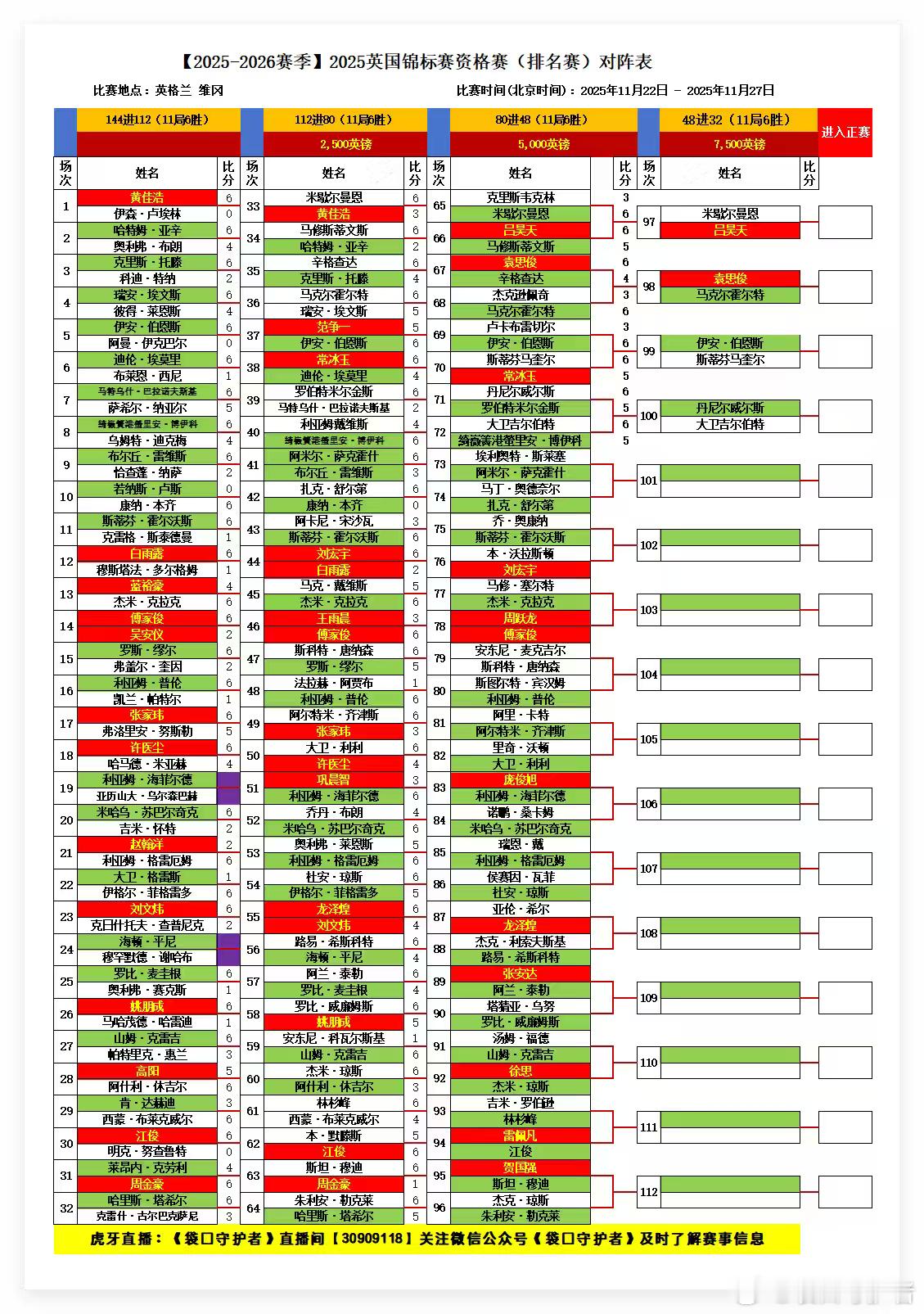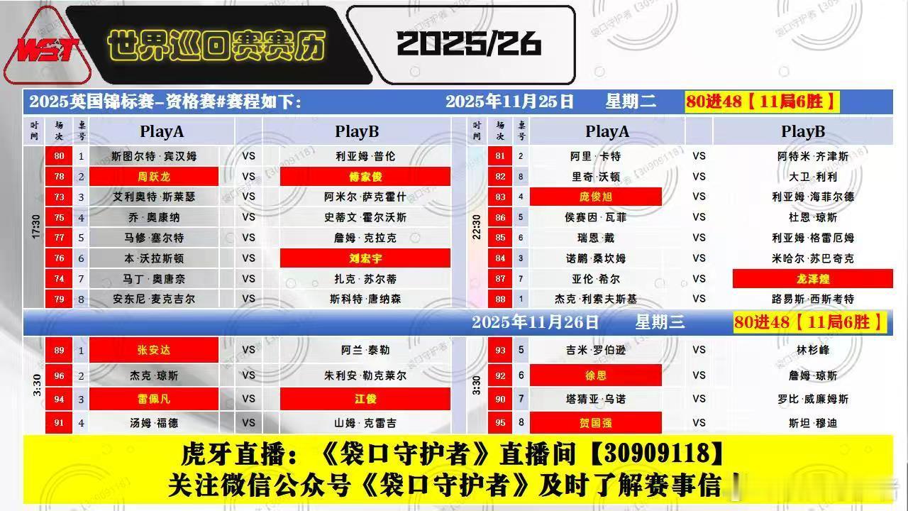 2025英国锦标赛资格赛80进48(11局6胜)中国选手吕昊天、袁思俊晋级482025.11.25日 星期二17:30:00直播: 傅家俊VS周跃龙22:30:00直播:庞俊旭VS海菲尔德