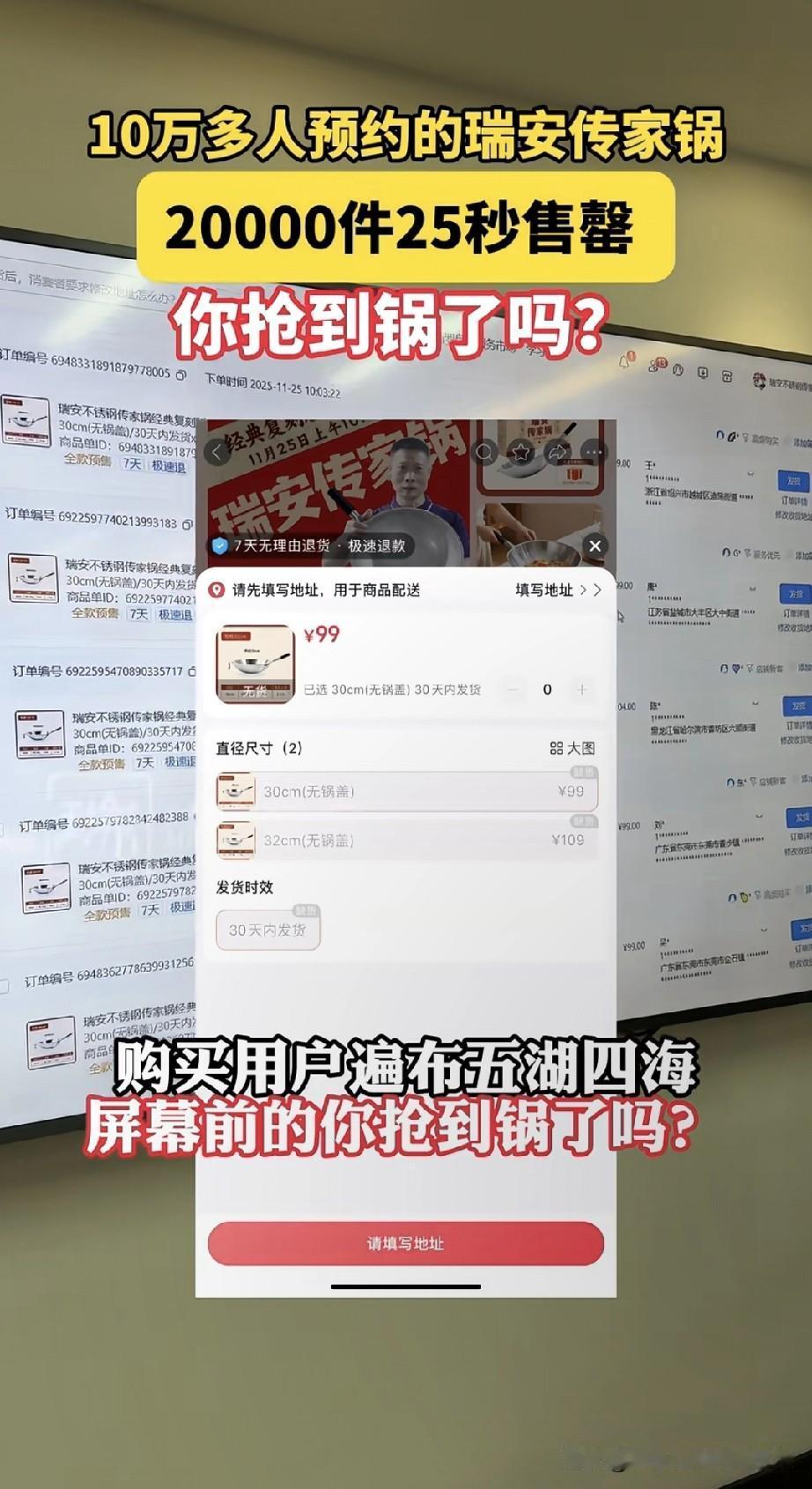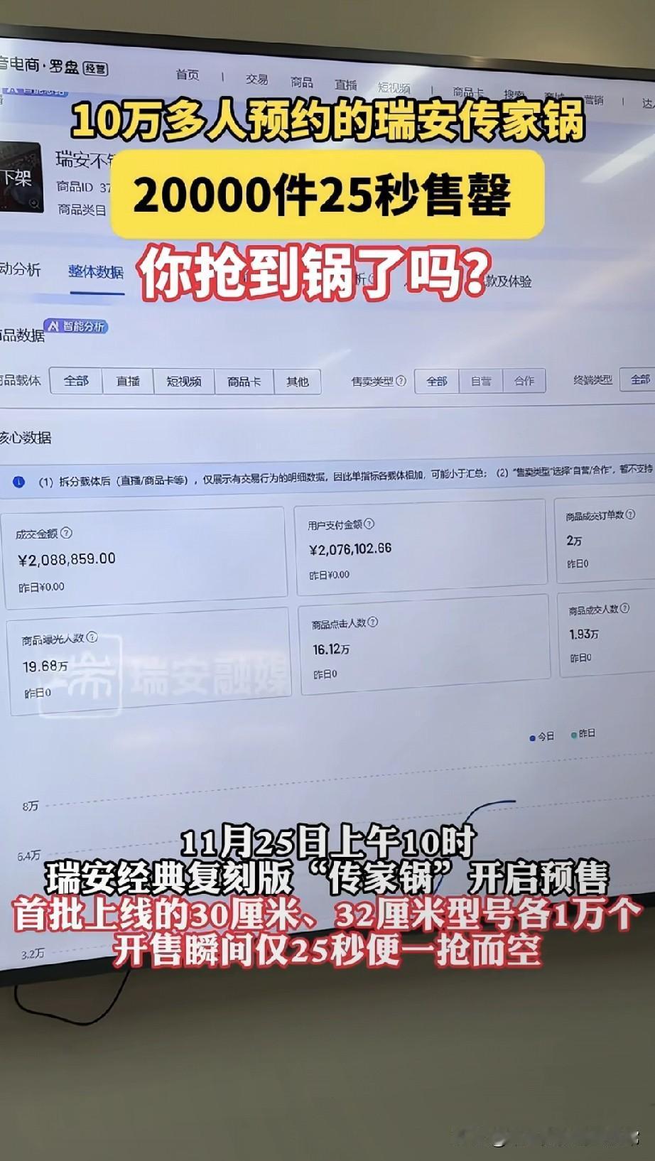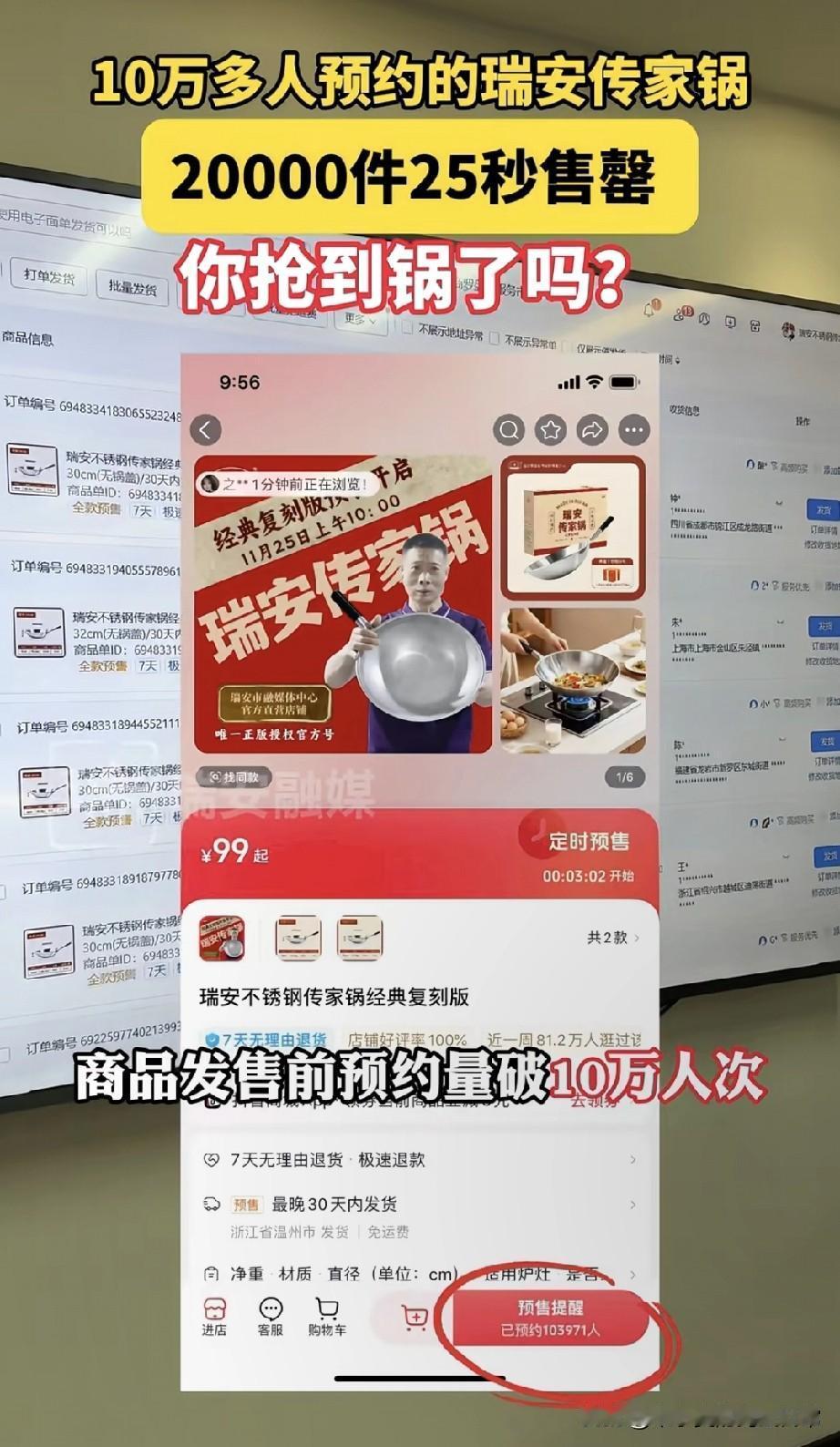 瑞安传家锅让10万人疯抢了! 今早10点,瑞安经典复刻“传家锅”刚开预售,30cm、32cm各1万个库存,直接被秒光——后台数据显示:25秒成交208万,19万+人围观,1.93万人抢到后狂喜晒单! 这锅凭啥这么横?老温州人都懂:以前瑞安锅是“能传三代”的硬货,这次复刻直接戳中“怀旧+实用”双buff,99元起的价更是杀疯了。看后台订单,从黑龙江到海南的地址挤爆系统,有人连下两单“给爸妈也抢一个”。 但我有点懵:25秒抢空是真刚需,还是饥饿营销?毕竟10万预约抢2万件,没抢到的网友已经在评论区喊“耍猴”了。 你觉得这波是真火爆,还是商家玩套路?