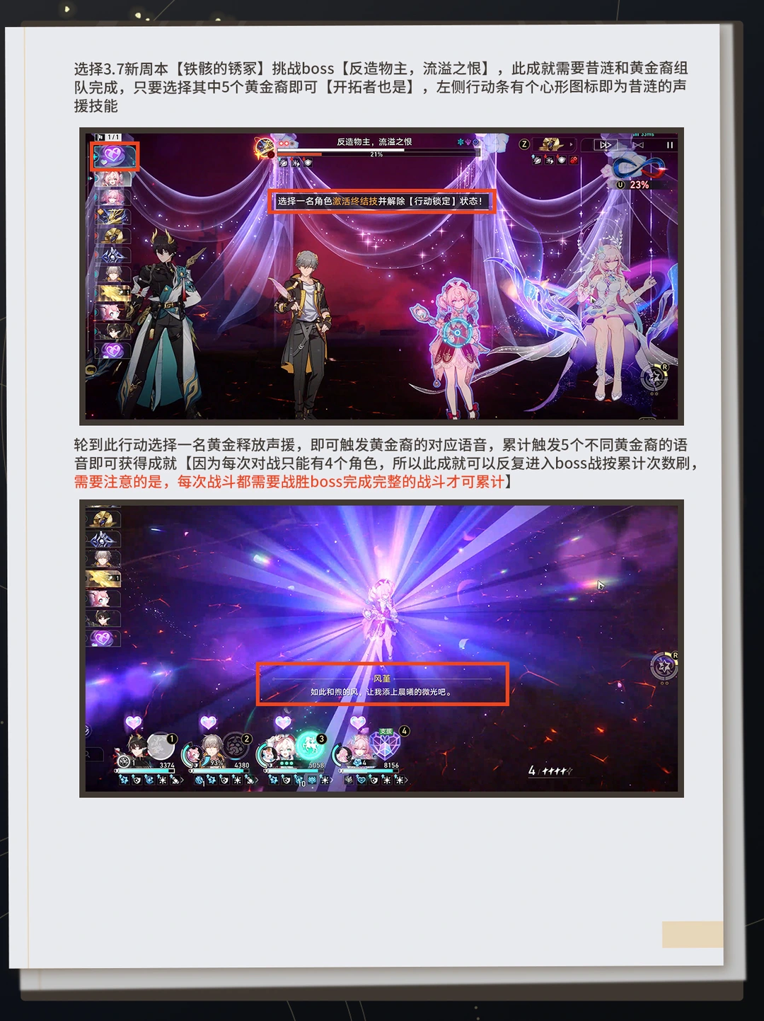 致翁法罗斯:在与「反造物主,流溢之恨,的战斗中,使用【昔涟的声援)】累计触发5种不同的声援语音