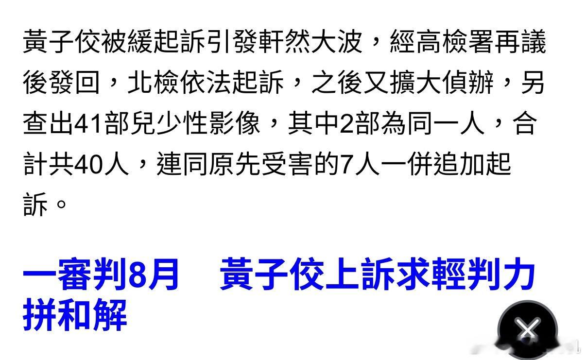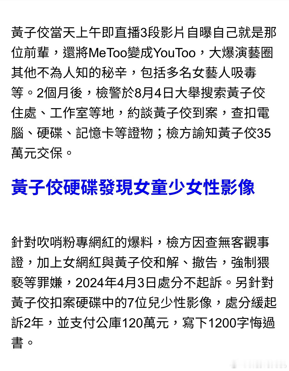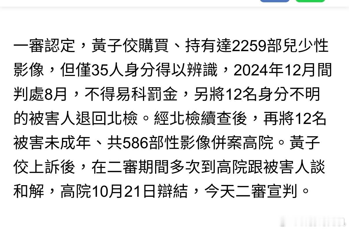 黄子佼二审判决出炉艺人黄子佼在「创意私房」论坛涉嫌付费下载大量未成年性影像,一审遭判8月,并科罚金10万元。昨日二审宣判前夕,黄子佼昨发表五点声明,除道歉外还说已和全部被害人和解。台湾省高等法院今(24)日判决,二审改依个资法,判1年6月,缓刑4年。