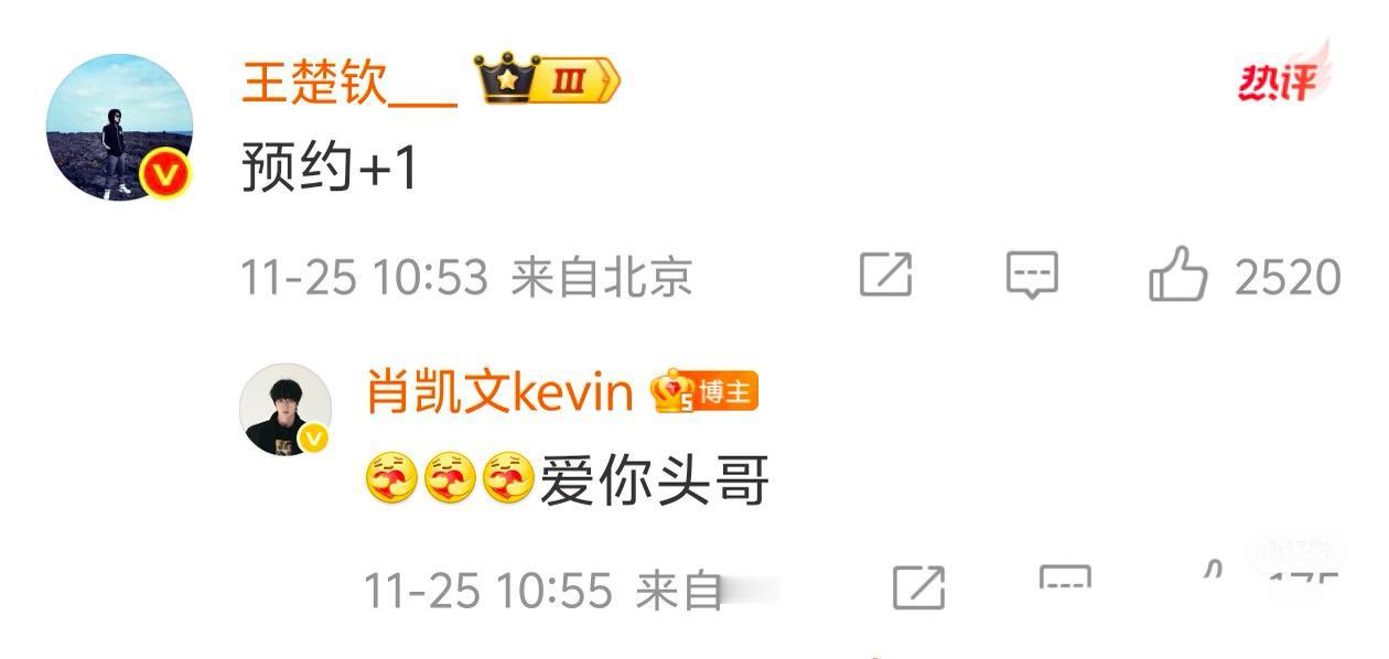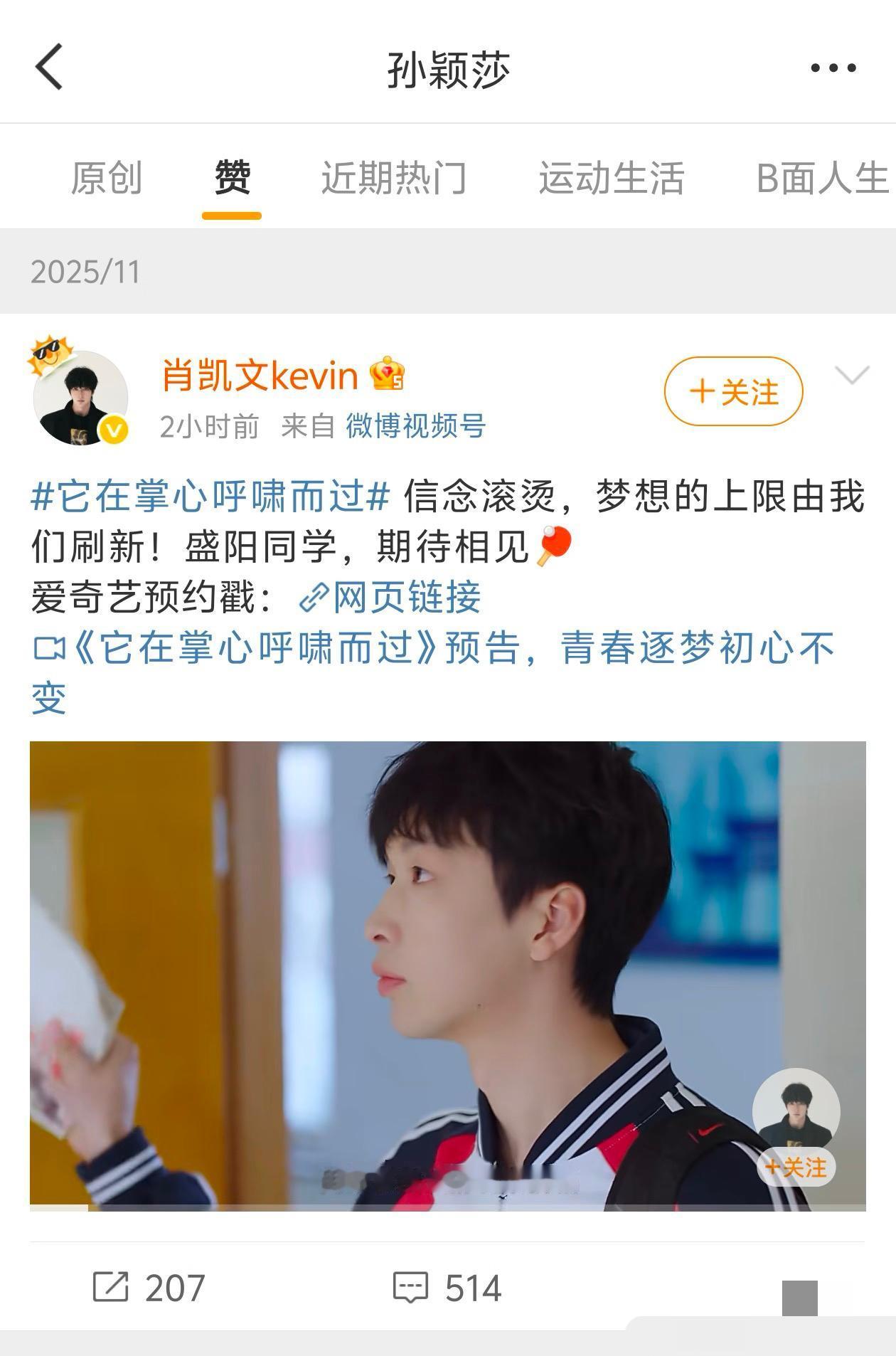 王楚钦与肖凯文平台亲密互动——互相支持 亲密无间 肖凯文也是学会如何利用乒乓球 为自己的剧增加收视率, 现在的体育圈星二代 和演艺圈星二代一样, 有流量,有实力, 好资源, 就算是明星的新剧也会有 朋友人脉代为宣传, 何况王楚钦与肖凯文都是对朋友 非常好的人,算是一起长大的发小, 互相支持无可厚非啊! 孙颖莎也点赞啦, 大家都是体面人, 这波属于是给内娱蹭到了 体育顶流了!