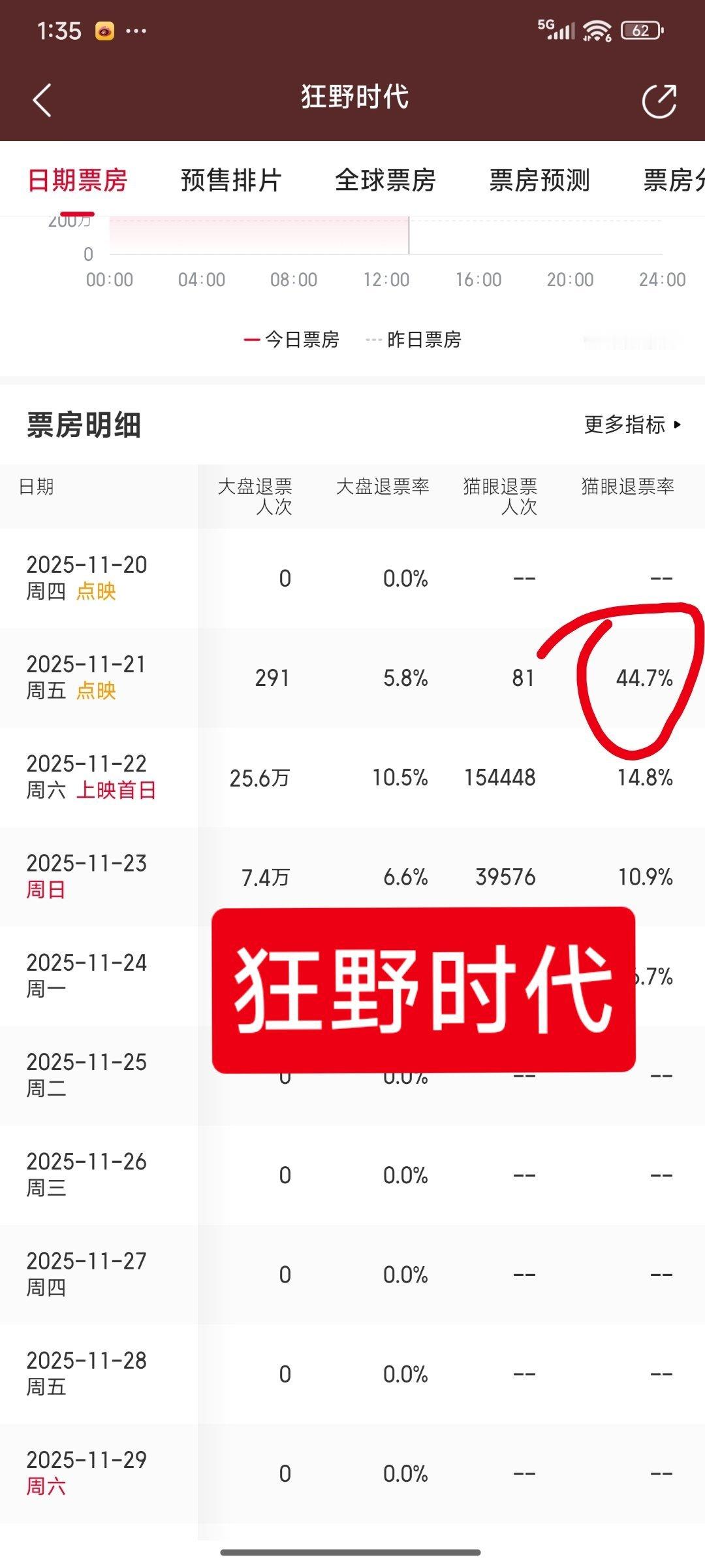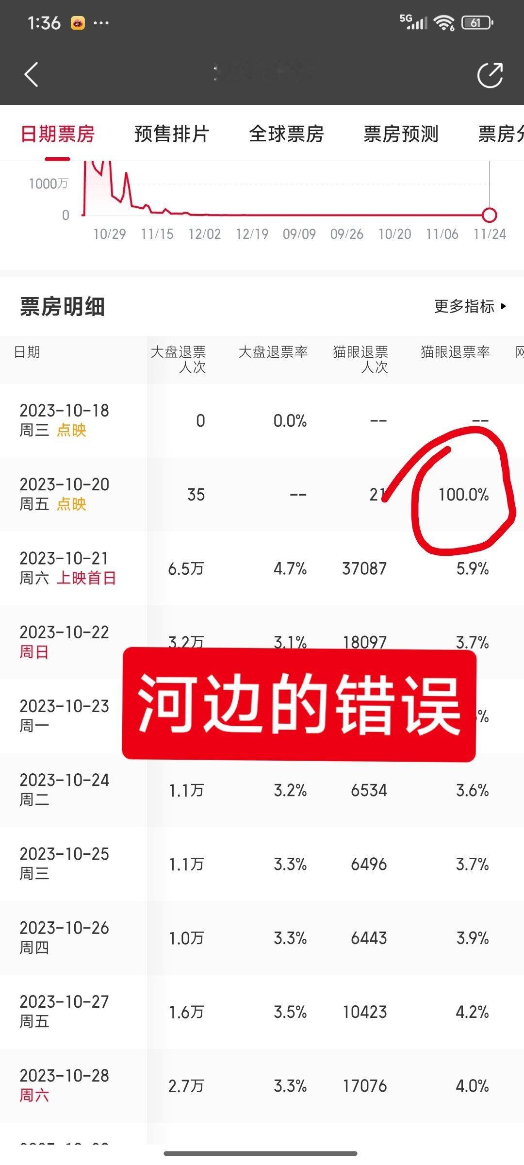 来看一组数据——❶易烊千玺主演的《狂野时代》,截止目前票房1.36亿。预售票房1.19亿。点映退票率44%。❷朱一龙主演的《河边的错误》,票房3.09亿。预售2400万,退票率100%。