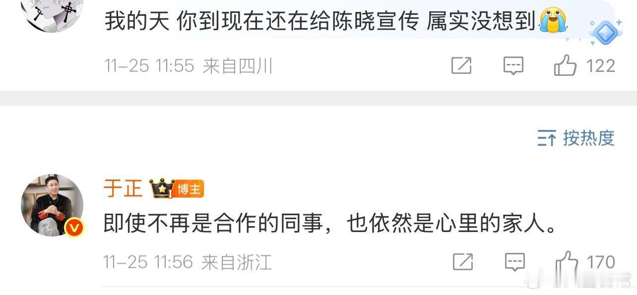 于正说陈晓即使不再是合作的同事,也依然是心里的家人