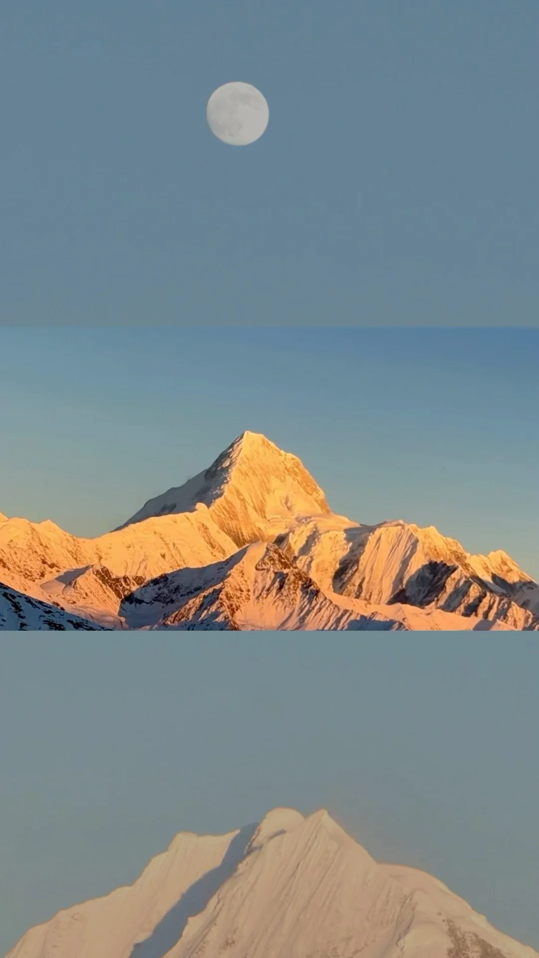 能够同时看到贡嘎雪山的日照金山和满月的月升金山,一年也没有几次机会,因为需要叠加日照金山和月升金山两个窗口期以及一定的气候条件。如果你看到的话,说明你真的幸运