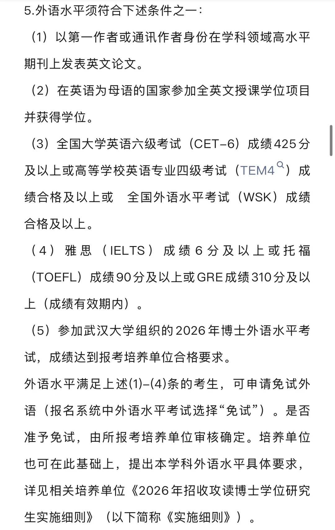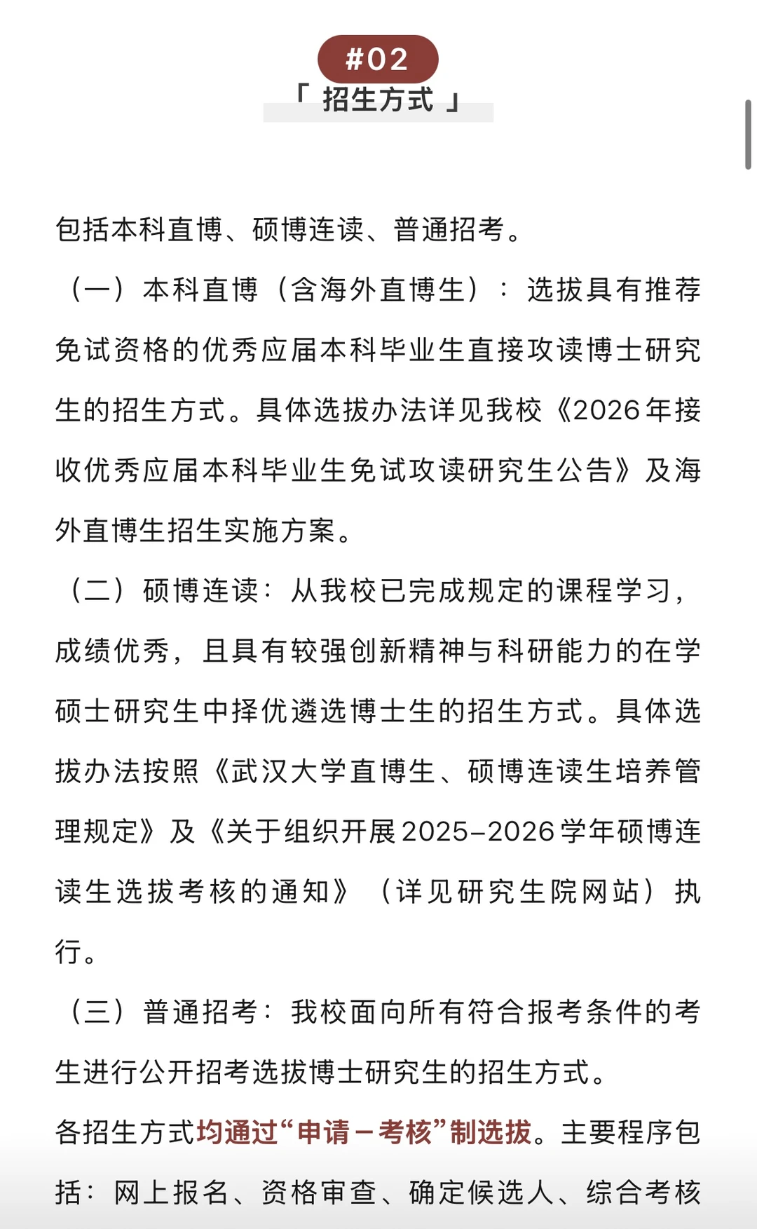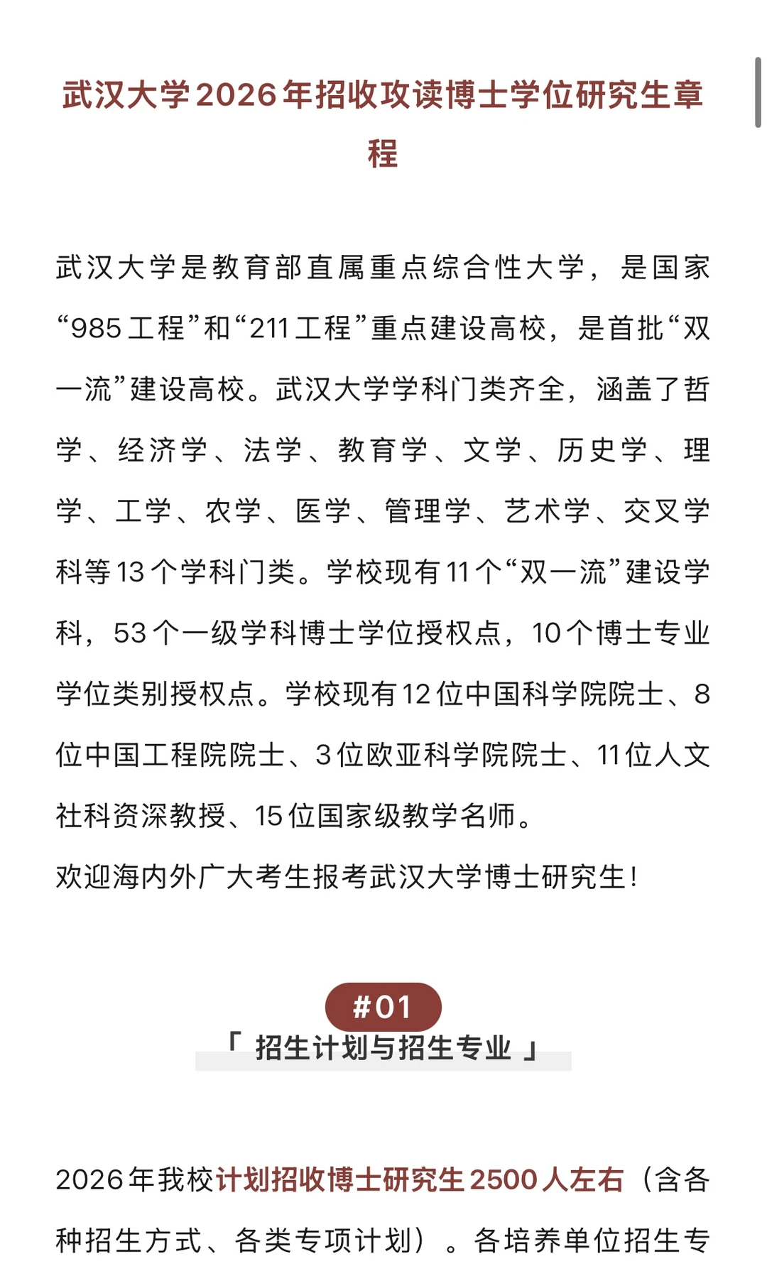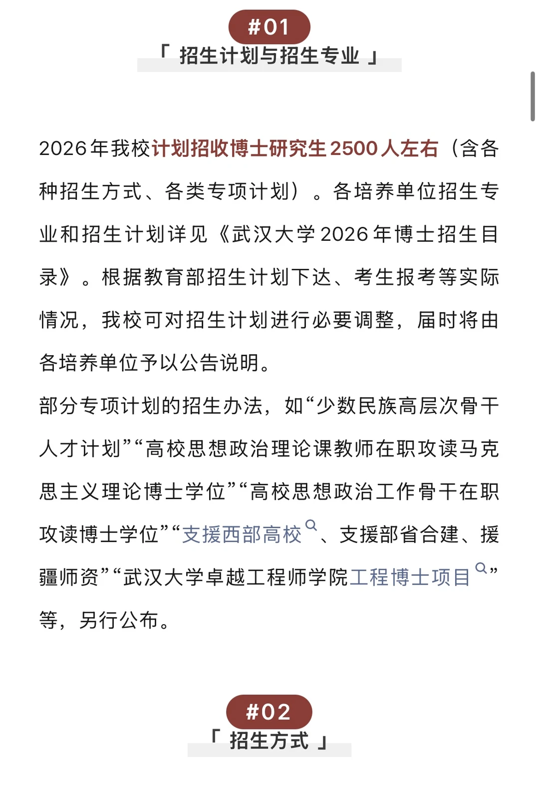 2026年我校计划招收博士研究生2500人左右(含各种招生方式、各类专项计划)。各培养单位招生专业和招生计划详见《武汉大学2026年博士招生目录》。根据教育部招生计划下达、考生报考等实际情况,我校可对招生计划进行必要调整,届时将由各培养单位予以公告说明。部分专项计划的招生办法,如“少数民族高层次骨干人才计划”“高校思想政治理论课教师在职攻读马克思主义理论博士学位”“高校思想政治工作骨干在职攻读博士学位”“支援西部高校、支援部省合建、援疆师资”“武汉大学卓越工程师学院工程博士项目”等,另行公布。